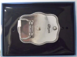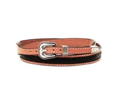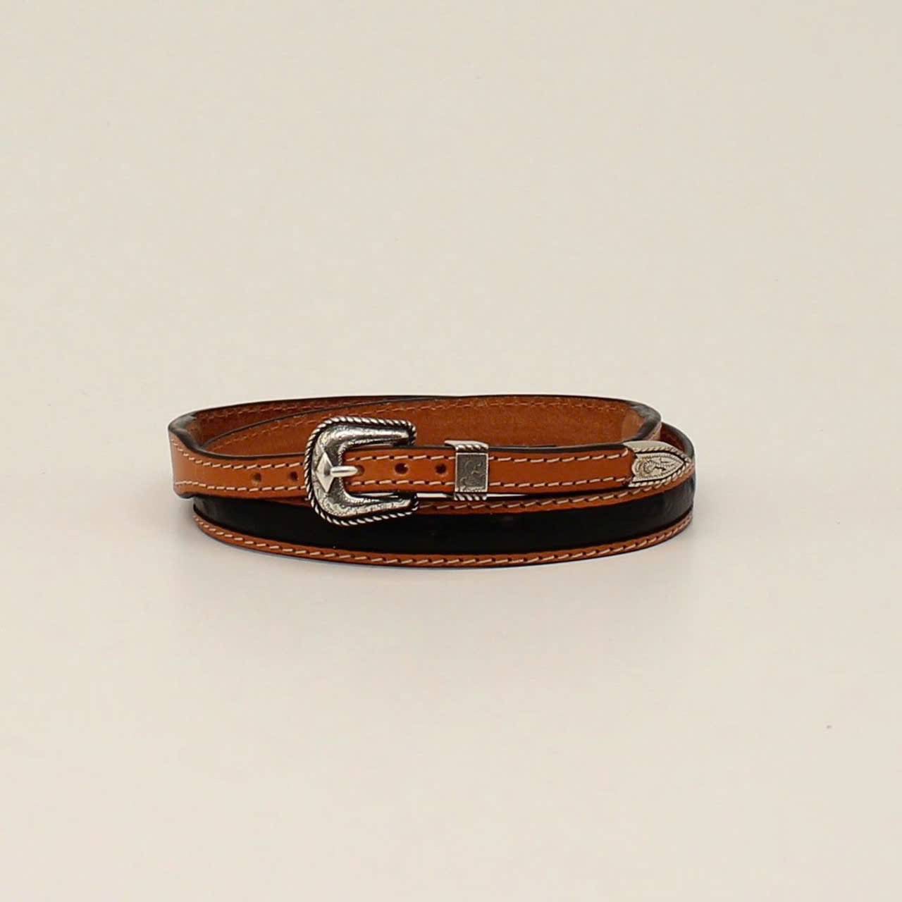 Genuine leather ostrich print hatband from 3D. Available in black and brown it measures 27″ long. Width is 1/2″ which tapers down to 3/8″ tabs. Features a 3 piece silver tone buckle set.