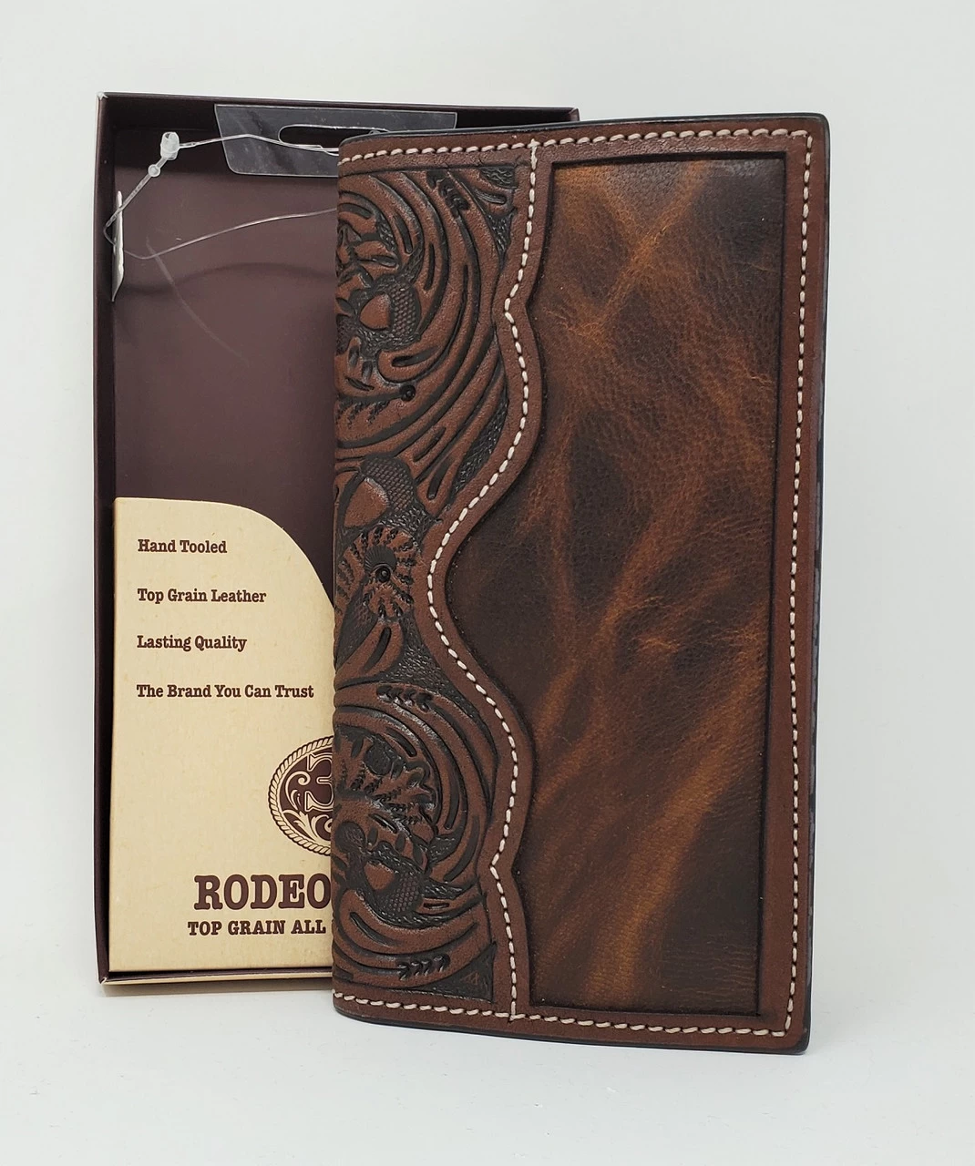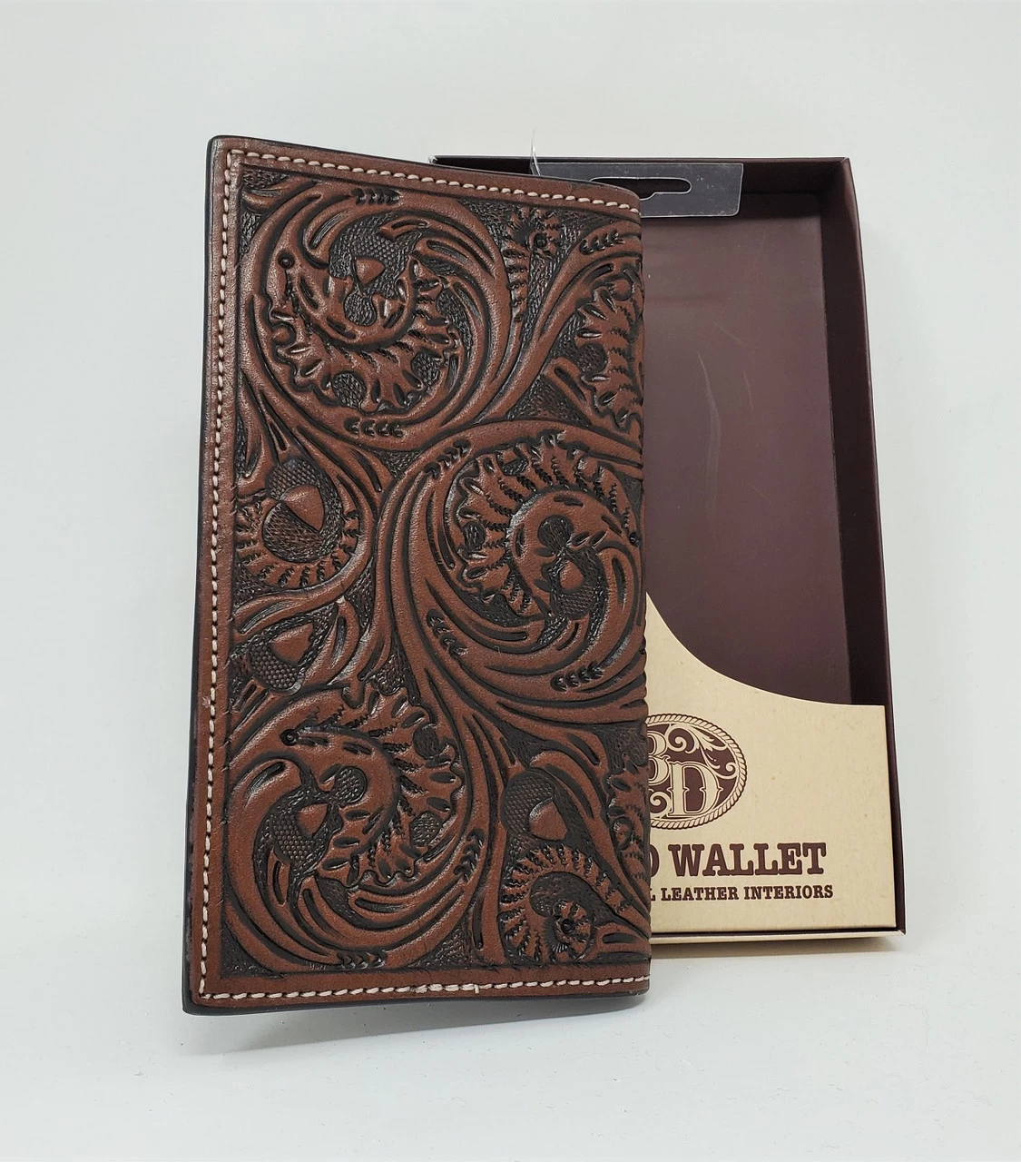 This brown rodeo wallet from 3D is made to last. Constructed of top grain leather it features a hand tooled floral acorn design. Inside you’ll find plenty of credit card slots, an ID window and places to store bills, receipts etc.