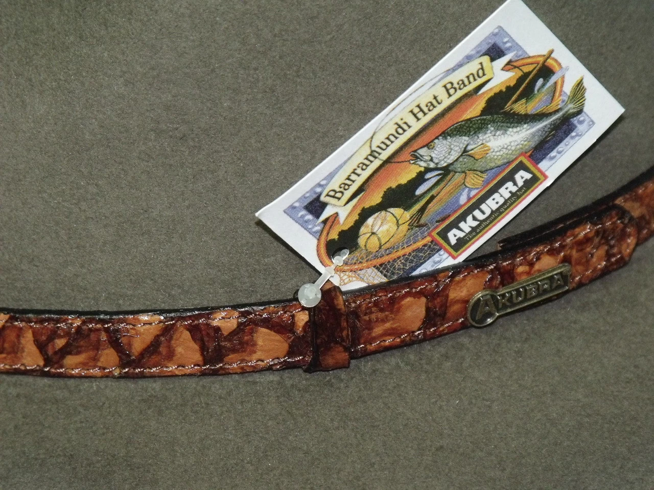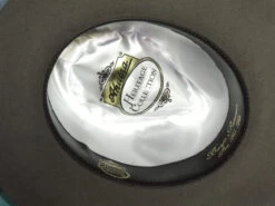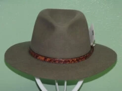 Renowned for quality Akubra brand hats are a favorite among hat aficionados. The Banjo Paterson from Akubra’s Heritage Collection is a great style suitable for town or country wear. The pre-creased crown has a wide center crease with side dents in the front. The crown is 4 inches high at the front, 4-1/2 inches at the sides. The brim is 2-3/4 inches wide, raw edge. The striking hat band, 1/2 inch wide, is made from the skin of the Barramundi, one of Australia’s fine food fishes found in the Condamine and other northern rivers of Australia. Reeded roan leather sweatband. Premium quality pure fur felt, fully lined.