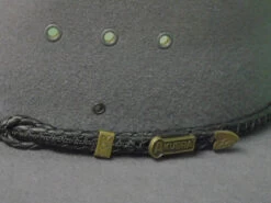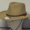 Renowned for quality Akubra brand hats are a favorite among hat aficionados. The Cattleman is the hat made for the Australian Stockman’s Hall of Fame, selected as the style typifying the hats used by the cattlemen in Australia. The Cattleman is appreciated by the working stockman because of the protection it gives against sun and rain for nose, ears, and back of the neck. This enduring Australian style a good choice for anyone spending time outdoors. It is pre-creased with a pinched telescope crown (approx. 4″ to peak of crown) and three eyelets each side of the crown. The 3-1/4 inch bound edge brim is turned down in front and back. Imperial Quality pure fur felt, fully lined, with hooks set inside the crown for easy attachment of a chin strap, and double round ornamental band with brass fittings. Reeded roan leather sweatband.