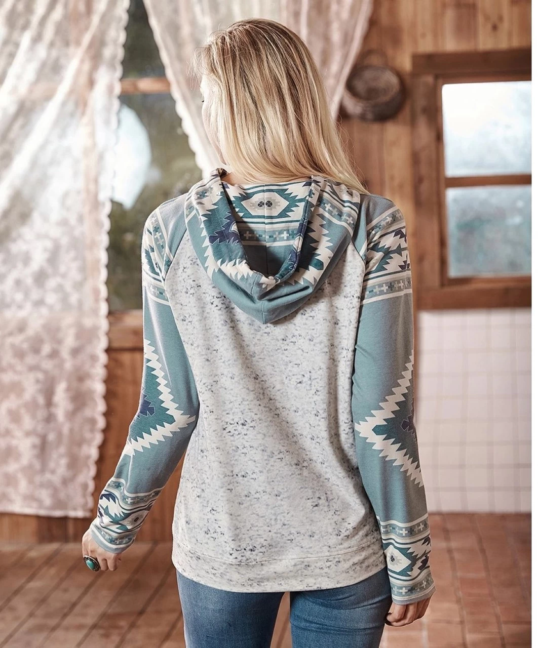 American Bling Apparel is your Bohemian and Western fashion source. Attention to trend in every detail. Quality to last and live in. * Aztec Graphic * Hoodie * 30% Cotton,65% Polyester, 5% Spandex.