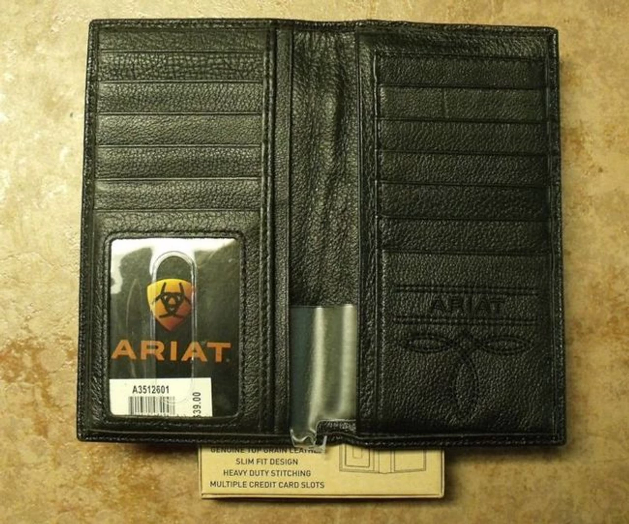 These genuine top grain leather wallets from Ariat feature a slim fit design, heavy duty stitching and an embossed Ariat shield.