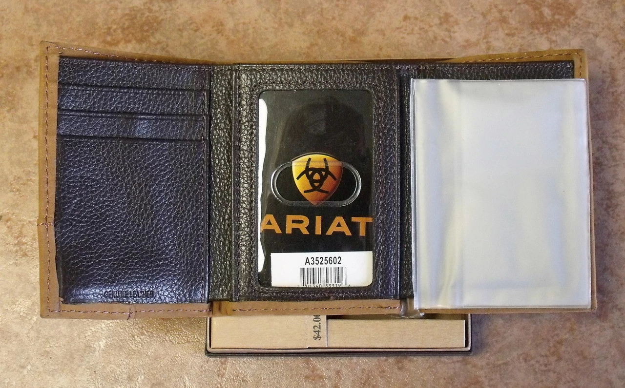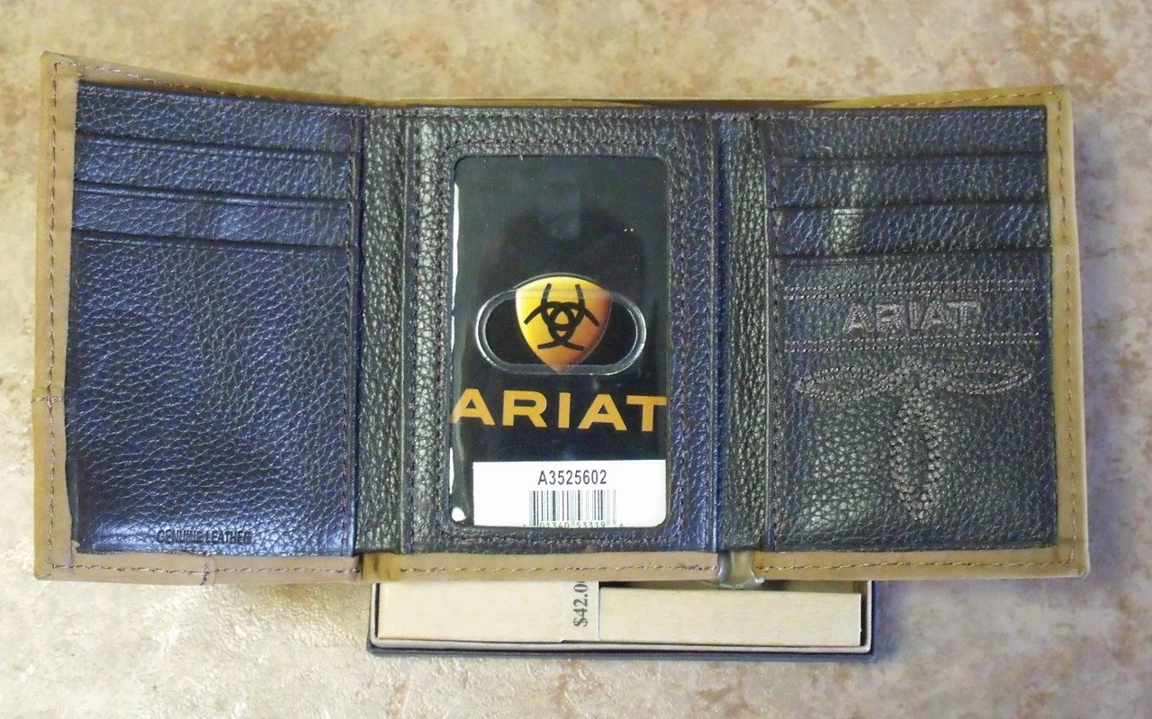 This great looking Tri-Fold wallet from Ariat is built to last. Made of top grain leather it features a brown crocodile print and metal Ariat logo.