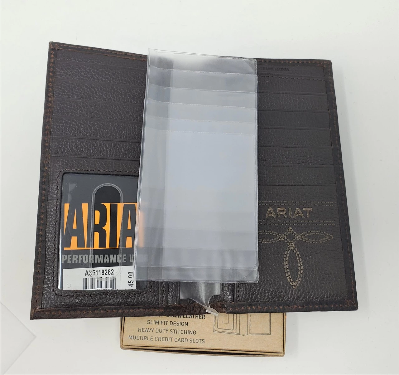 These genuine top grain leather wallets from Ariat are available in Dark Copper, Golden Brown and Rowdy Brown. They feature a slim fit design, heavy duty stitching and the Ariat shield.