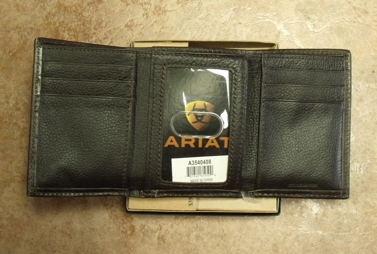 Genuine top grain, chocolate brown leather Trifold wallet by Ariat. Features include a basket weave and floral scroll design, heavy duty stitching, embossed Ariat lettering and a metal Ariat shield.