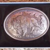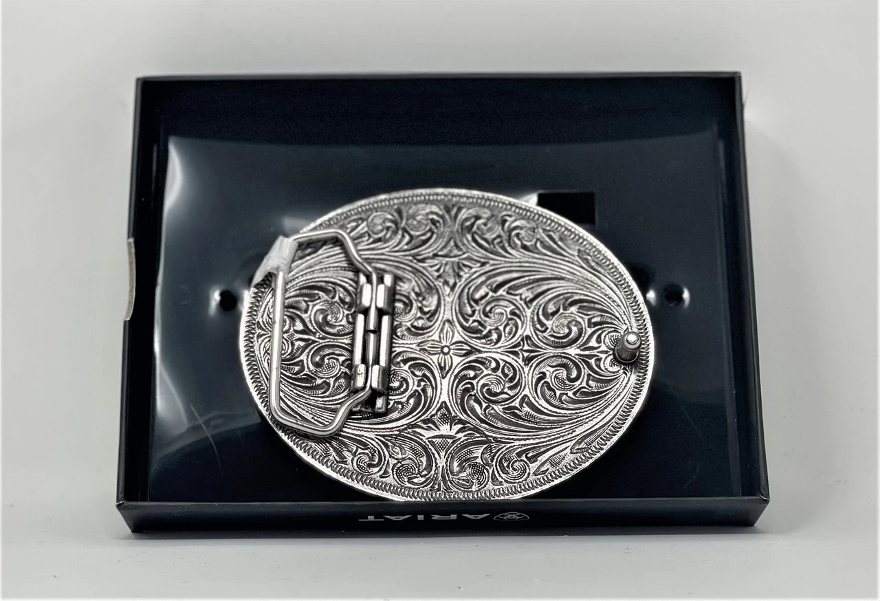 Ariat silver tone oval belt buckle featuring the Ariat logo.