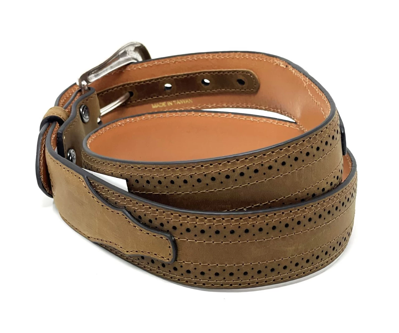 Ariat’s basic men’s belt is constructed of genuine full grain distressed leather. The strap is 1 1/2″ wide and features a perforated edge and a removable buckle.