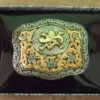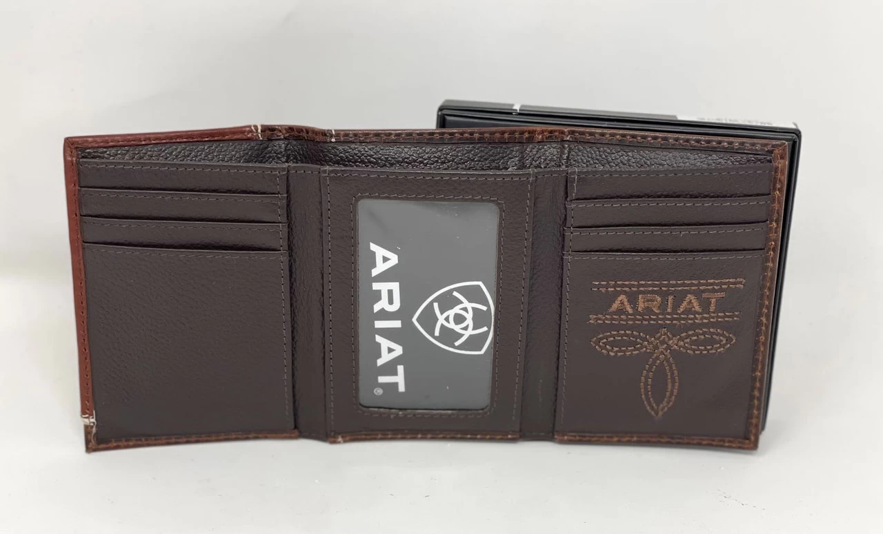 Ariat brown and tan, top grain leather tri-fold wallet with an embossed Ariat shield. It features credit card slots, ID window and a bill holder.
