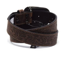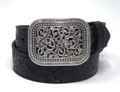 This ladies Ariat belt has floral embossed leather strap and a filagree buckle embellished with rhinestones. Available in multiple colors it is 1 1/2″ wide and the removable buckle is approximately 3 1/2″ by 2 1/2″.