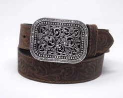This ladies Ariat belt has floral embossed leather strap and a filagree buckle embellished with rhinestones. Available in multiple colors it is 1 1/2″ wide and the removable buckle is approximately 3 1/2″ by 2 1/2″.