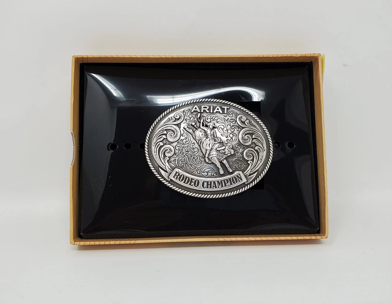 Youth’s pewter Rodeo Champion western belt buckle by Ariat. Features a Bull Rider on a floral background. Measures 1 1/2″ x 2 1/8″ and fits belts up to 1 1/4″ wide.
