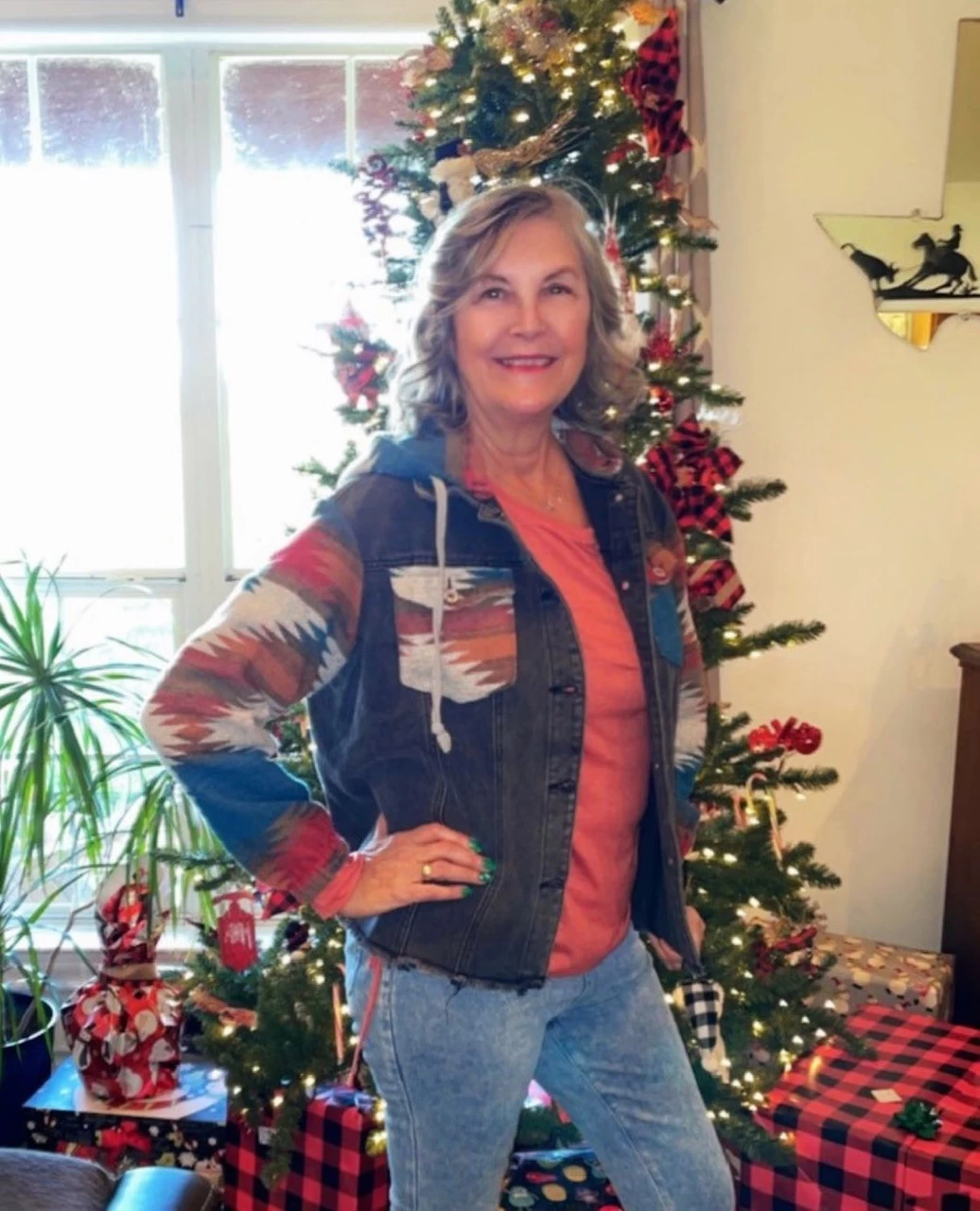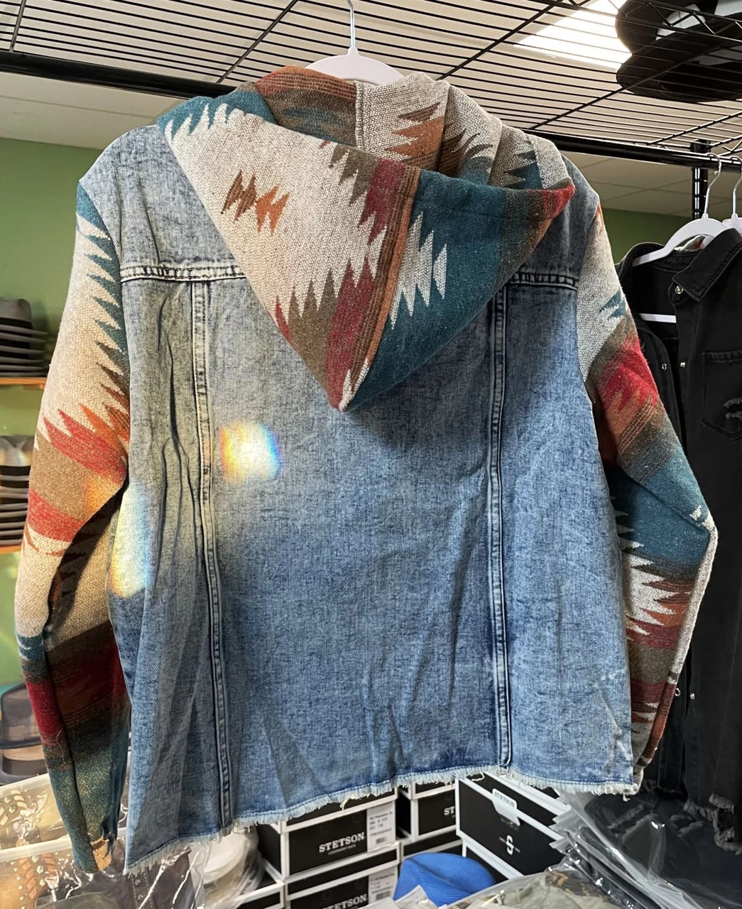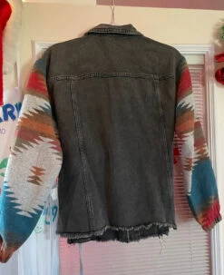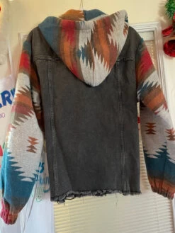 This hot boho vintage Aztec western style denim jacket is spiced up with Aztec pattern contrast sleeves, button front, removable hood and flap pockets at the chest. Made in China of 75% cotton and 25% polyester.