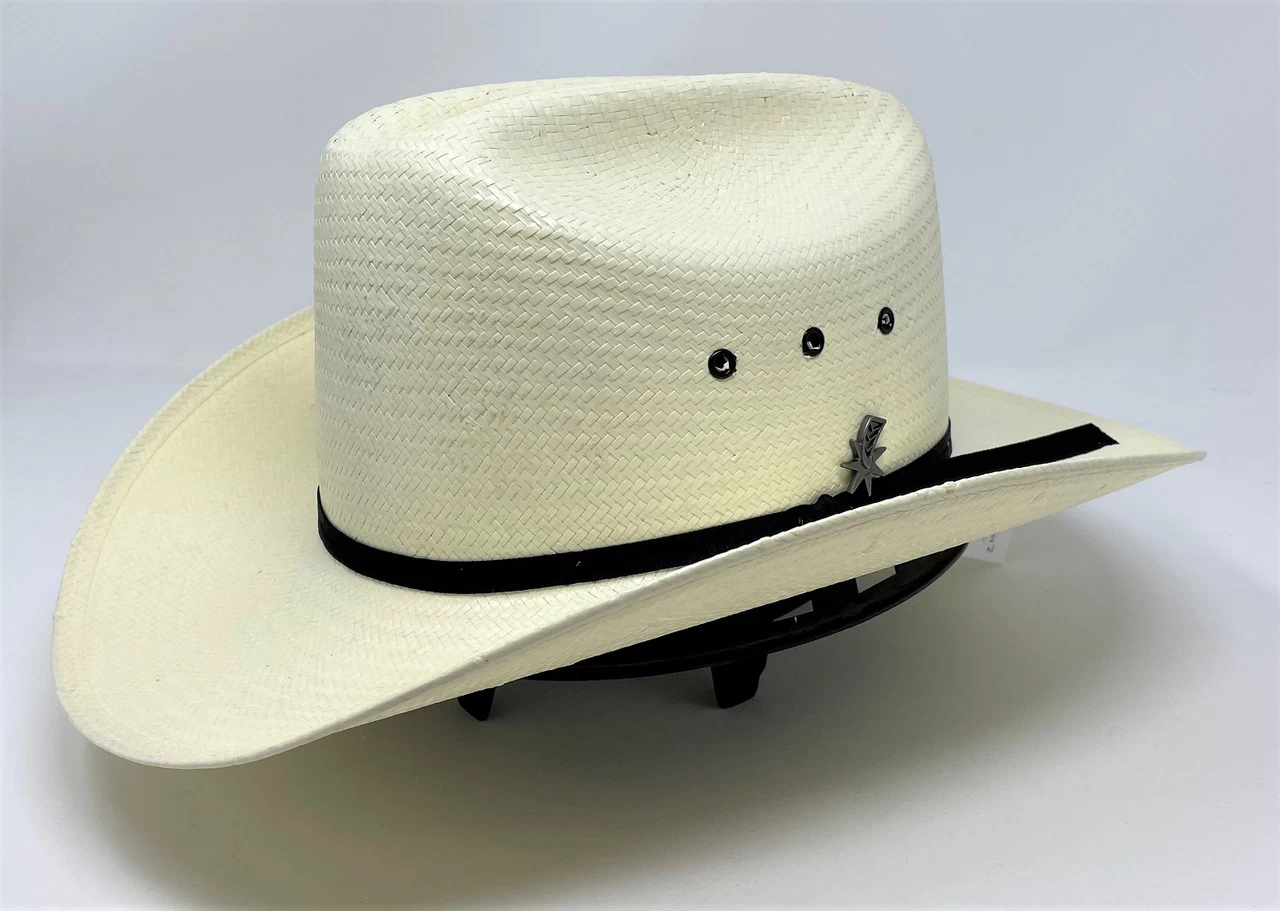 Made in the USA by Bailey the Guthrie is a classic design. Constructed of 7X Shantung Panama straw it has a 4″ stockman crown and 3 1/8″ brim. Features include eyelets, a Dri-Lex® sweatband and black grosgrain ribbon band and a spur pin.