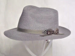 The Aviator is a 100% natural hemp fedora from Biltmore’s President series of hats. Made in the USA it has a 2 1/4″ brim and a Teardrop crown that is 4 1/4″ at the front, rising to 5″ on the sides and falling to 3 3/4″ at the back (measurements are approximate). Features include a grosgrain ribbon band with feather accent Biltmore pin and a Vom Baur sweatband.