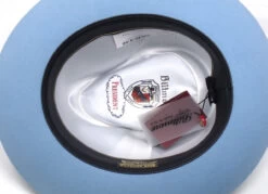The Erte is a classy, unisex fedora with a western flair. Made in the USA it is from Biltmore’s President Collection and has a 2 1/2″ raw edge brim and a 4″ (at front crease) crown. Features include a narrow black and grey leatherette band with a 3-piece buckle and decorative feather, a leather sweatband and full satin lining.