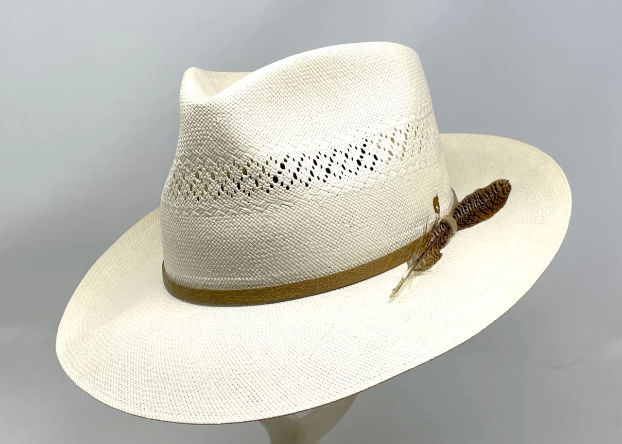 Made in the USA, Biltmore’s Wild fedora is constructed of hand woven extra fine Shantung straw. It has a 2 3/4″ (approx.) underwelt brim and a teardrop crown measuring approximately 4 1/4″ at the front crease and 3 3/4″ at the back. Additional features include all around venting, an exotic ostrich band, feather and a moisture wicking fabric sweatband.