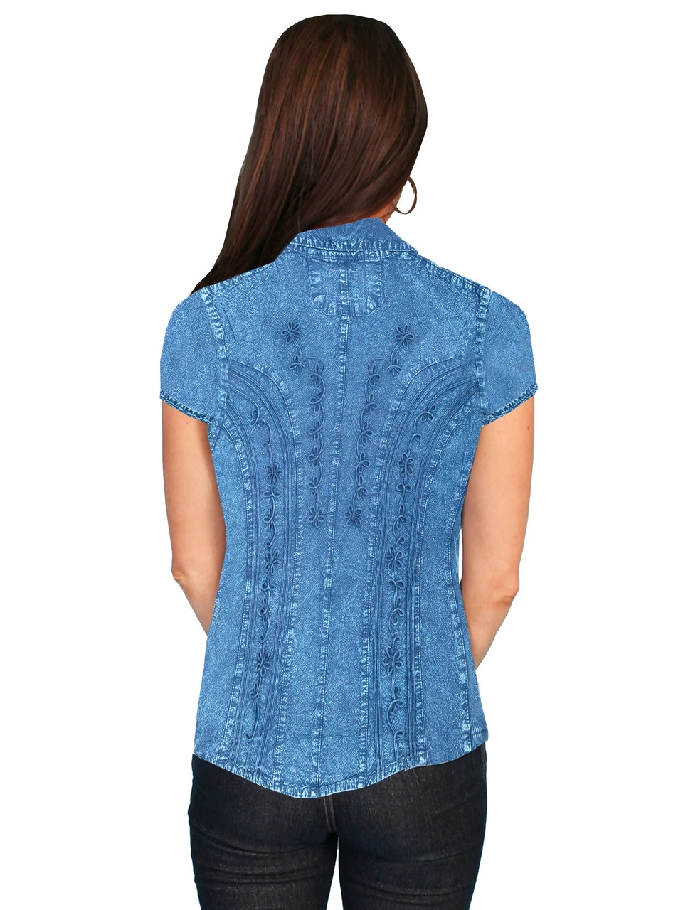 This lovely capsleeve blouse is from Scully’s Cantina Coolection. Made of 100% peruvian cotton it features a button front with loop closures, point collar, floral vine soutache design on the front and back, and a discreet comfort panel on the sides.