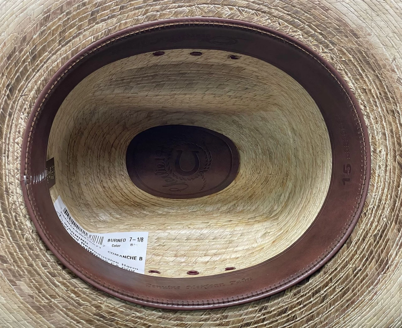A great looking burned Mexican palm leaf hat by Charlie 1 Horse. The “Comanche” has a 4-1/2″ crown with eyelets, 4″ bound-edge brim and a faux leather sweatband.