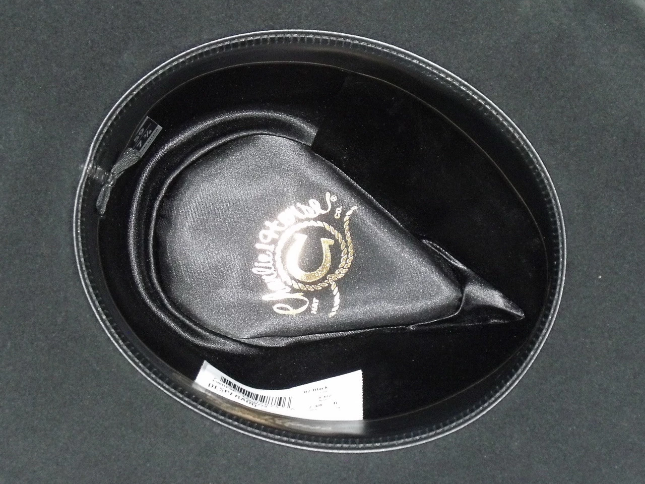 The Desperado is from Charlie 1 Horse’s Wild West collection. Made in the USA of premium 3X wool which has been sweated and dusted. It has a 3-1/2″ brim, 4-1/2″ pinch front crown. Features include a ribbon band and bolo cord with bead closure and fancy tips, faux leather sweatband and satin lining.