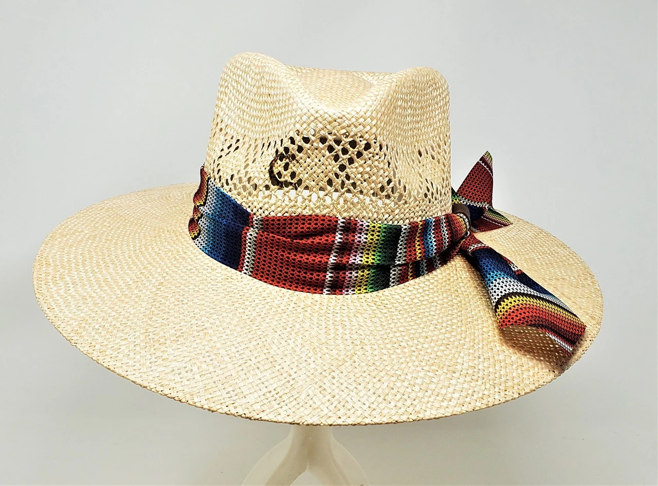The Fiesta is a beautiful hat from Charlie 1 Horse’s Wanted Collection. It has a 4 1/4″ vented, pinch front crown and 3 3/4″ wired brim. Constructed of Sisal straw it features a Dri-Lex sweatband and is adorned with a colorful, southwestern fabric band, C1H firebrand and a Dri-Lex sweatband.Â