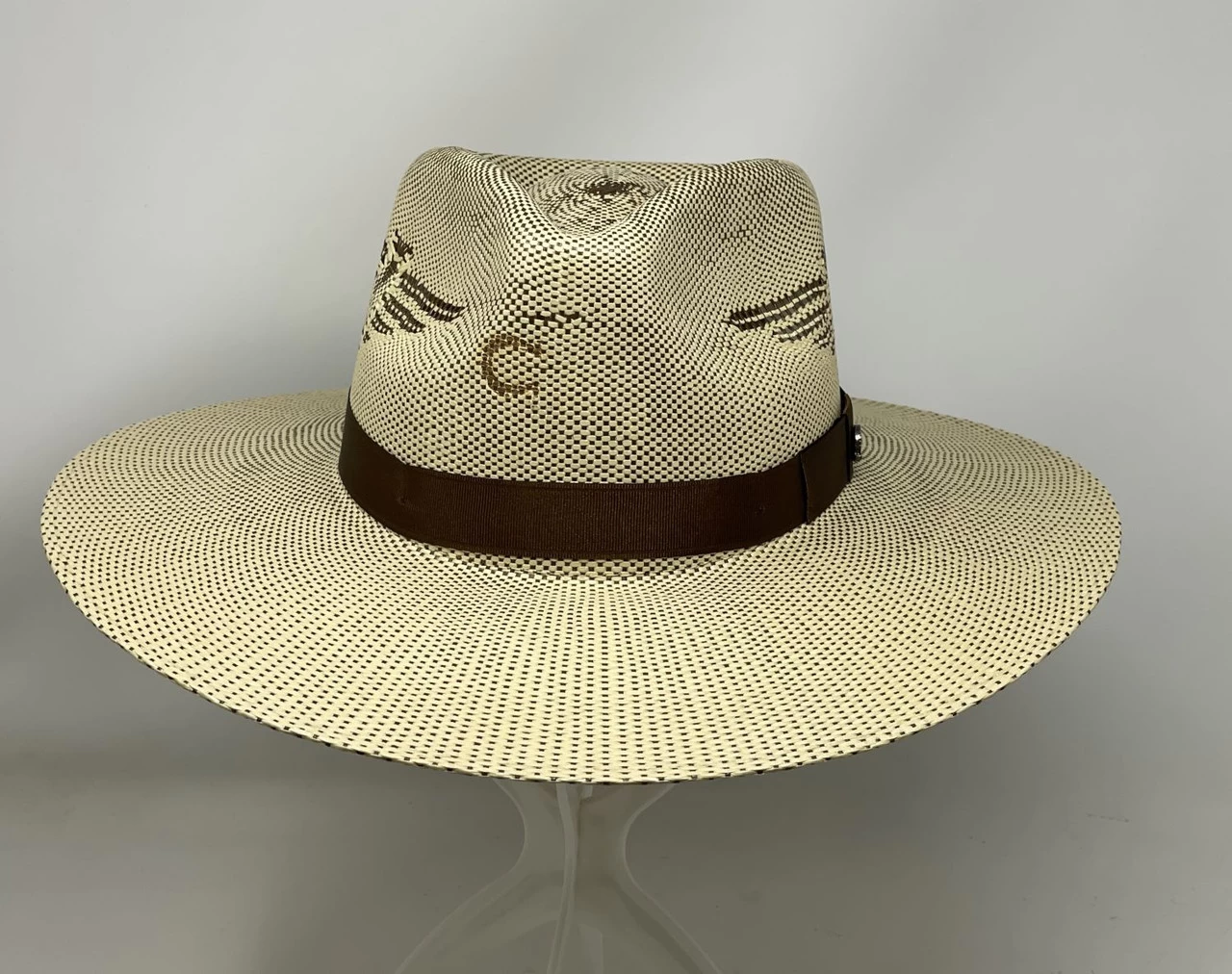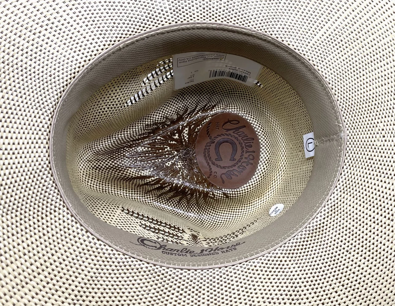 The Mexican Shore is a nice all around summer hat from Charlie 1 Horse’s Wanted Collection. Made of bangora straw it has a 4 1/8″ pinch front crown with thunderbird shaped ventilation, and a 3 3/4″ shapeable wire brim. Features include a grosgrain ribbon band with the C1H pin, the horseshoe “C” firebrand, and a soft, comfortable cotton sweatband.