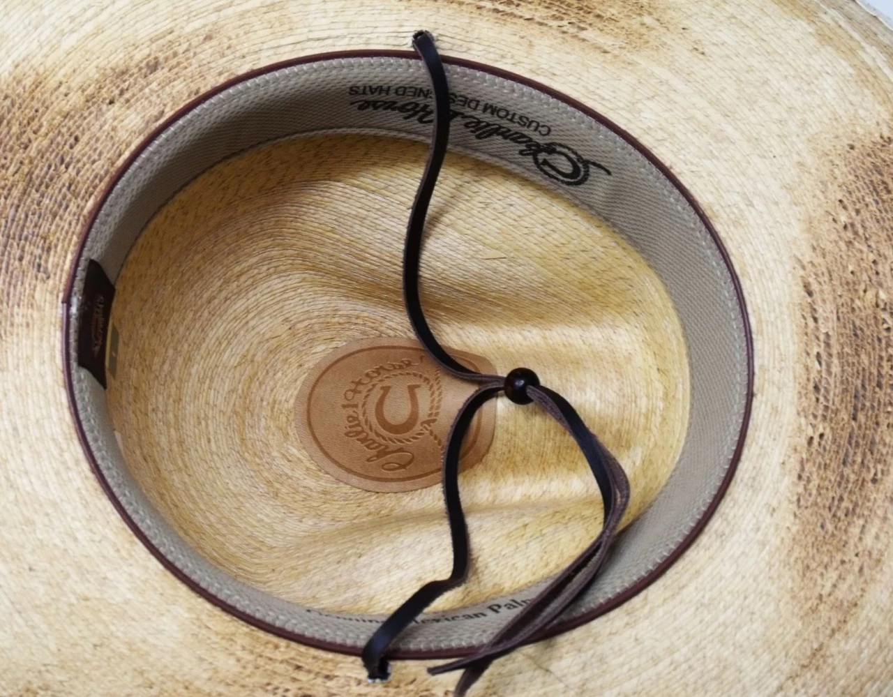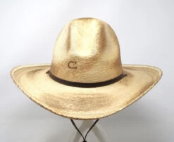 The Ride or Die is from Charlie 1 Horse’s Wild West Collection. Constructed of soft, burnt, natural palm it has a 4″ brim and a Gus style crown which measures approximately 4″ in front and 5 1/2″ in back. Features include the horseshoe C brand, leather band, stampede/chin strap and a Dri-Lex sweatband.Â