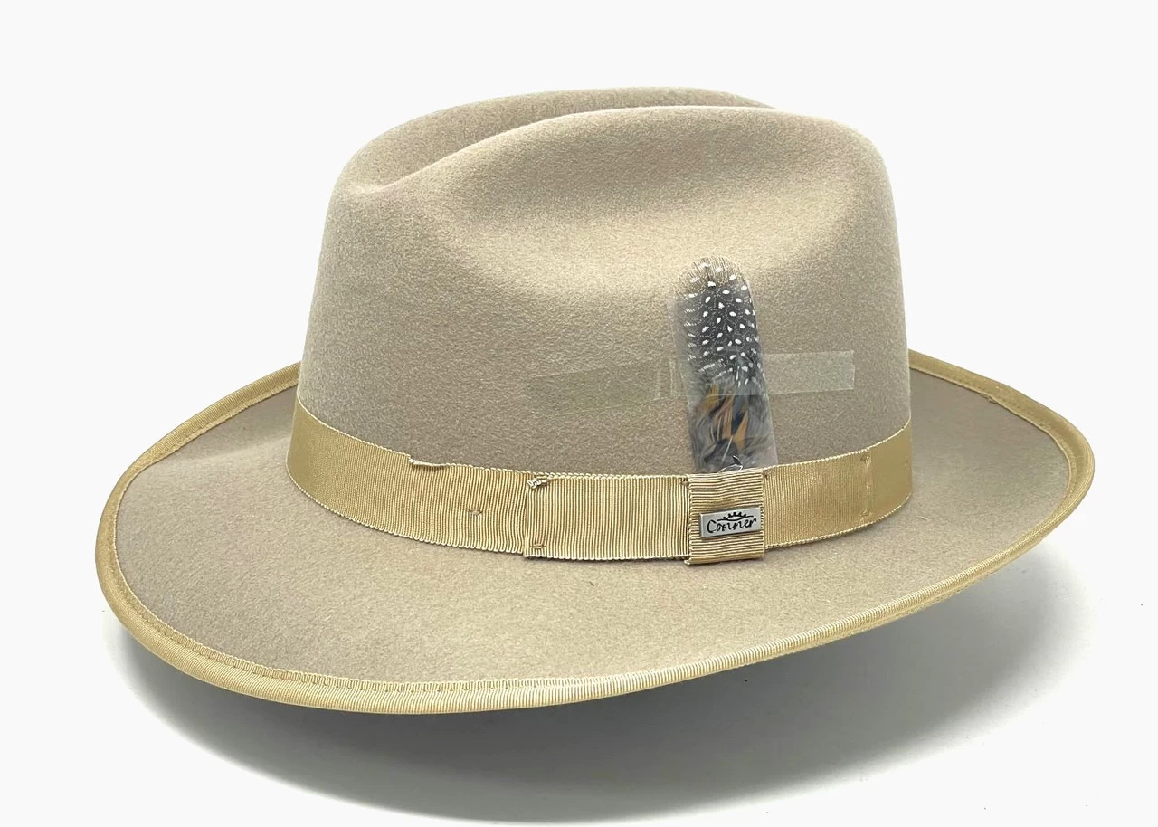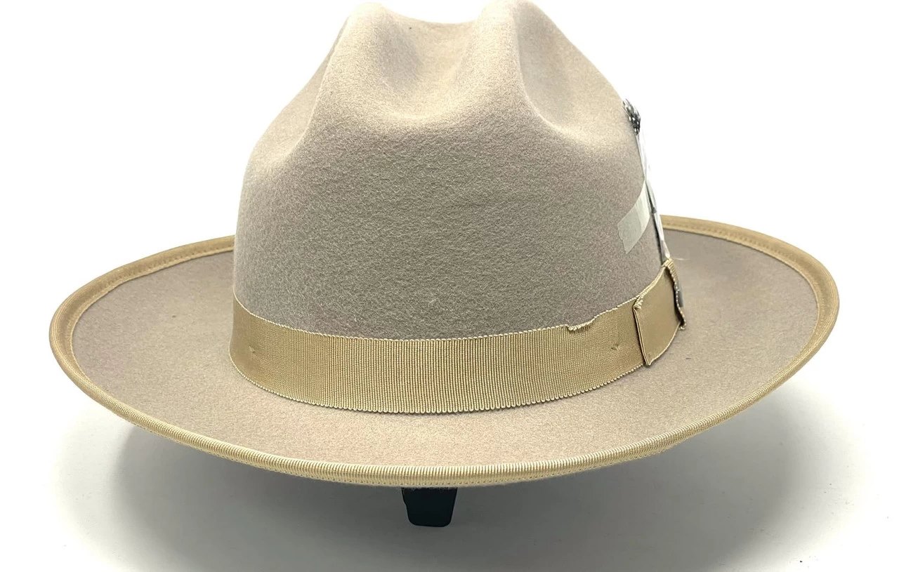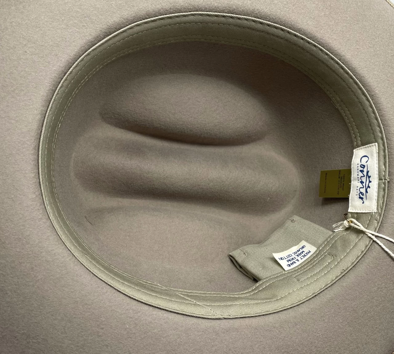 The Axe Western Hat is a silverbelly (light tan)-style wool hat, with a classic western cattleman crown, and a slight upturned brim. This hat is a stylish blend of city and western, and can be dressed up for a night on the town just as easily as it can turn it down on a front porch with a guitar.  Features a bound edge brim, and grosgrain band with a feather accent.