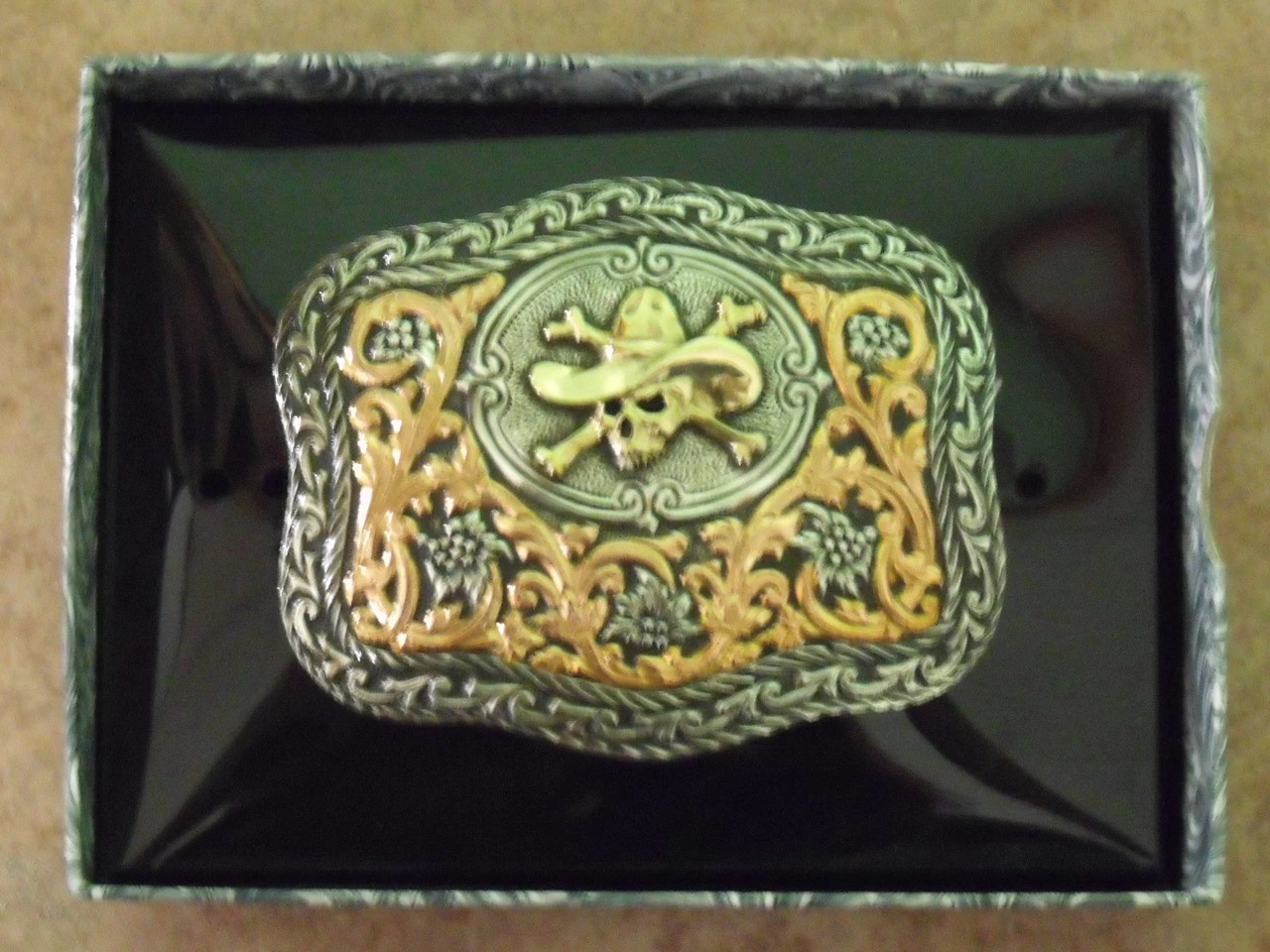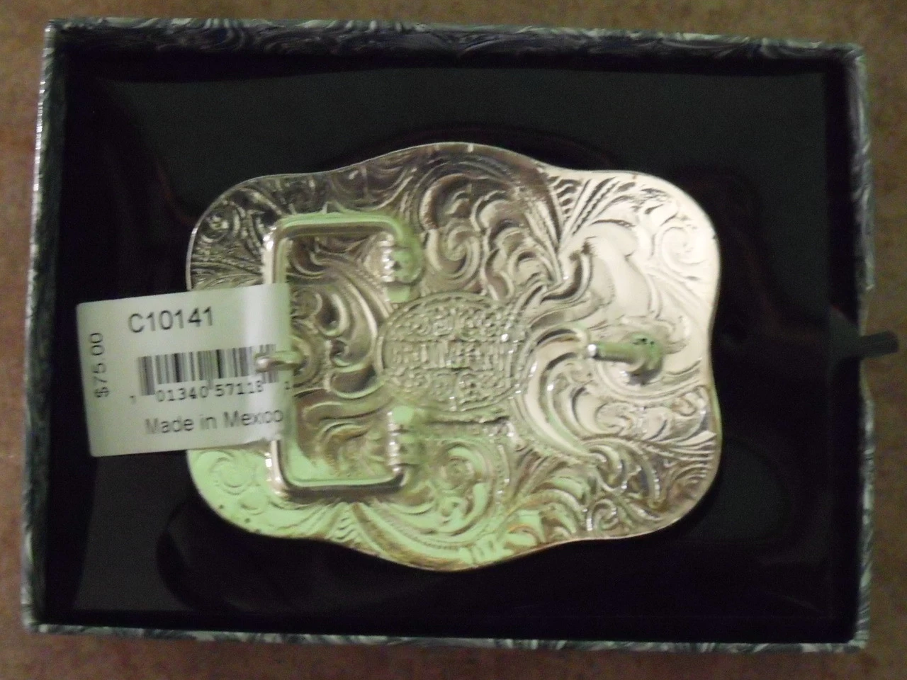 This Cowboy Skull buckle by Crumrine is made antique silver plate with hand engraved copper plated highlights. It measures 3 3/4″ x 2 3/4″ and will fit belts up to 1 1/2″ wide. To insure the quality of the finish it features Tuff Guard protection.