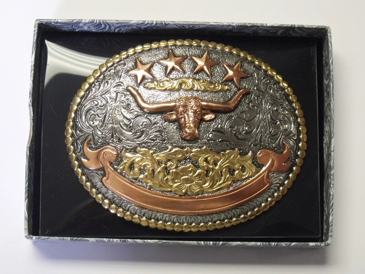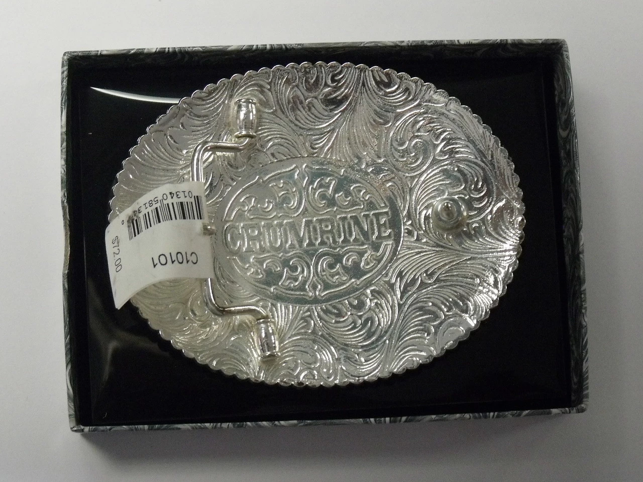 This Longhorn engravable buckle by Crumrine is made of antique silver plate with hand engraved copper plated highlights. It measures 3 3/4″ x 4 1/2″ and will fit belts up to 1 1/2″ wide. To insure the quality of the finish it features Tuff Guard protection.