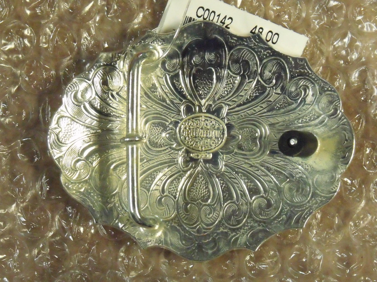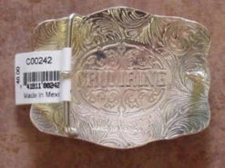 Solid and heavy weight, small buckle by Crumrine in silver and gold plate featuring a mare and colt heads. It comes boxed, measures 2 1/2″ X 3 1/4″ and will fit belts up to 1 1/2″ wide.