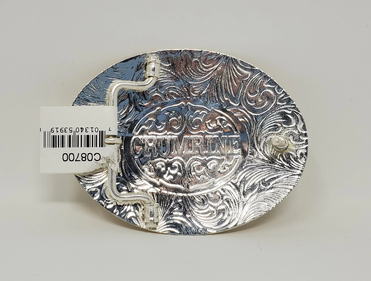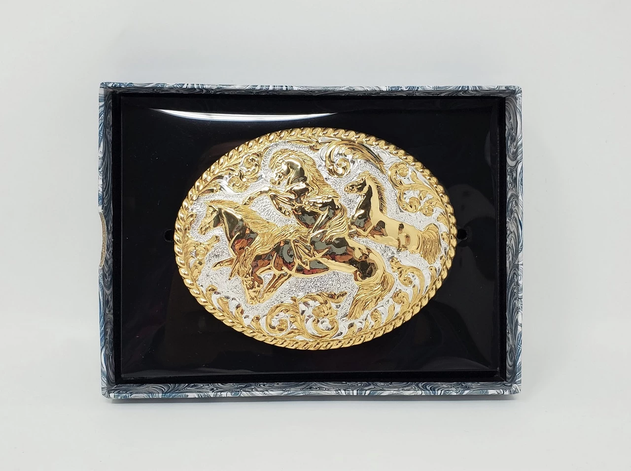 Large buckle by Crumrine in silver and bronze plate featuring five wild horses. It comes boxed, measures 3 1/2″ X 4 1/2″ and will fit belts up to 1 1/2″ wide.
