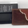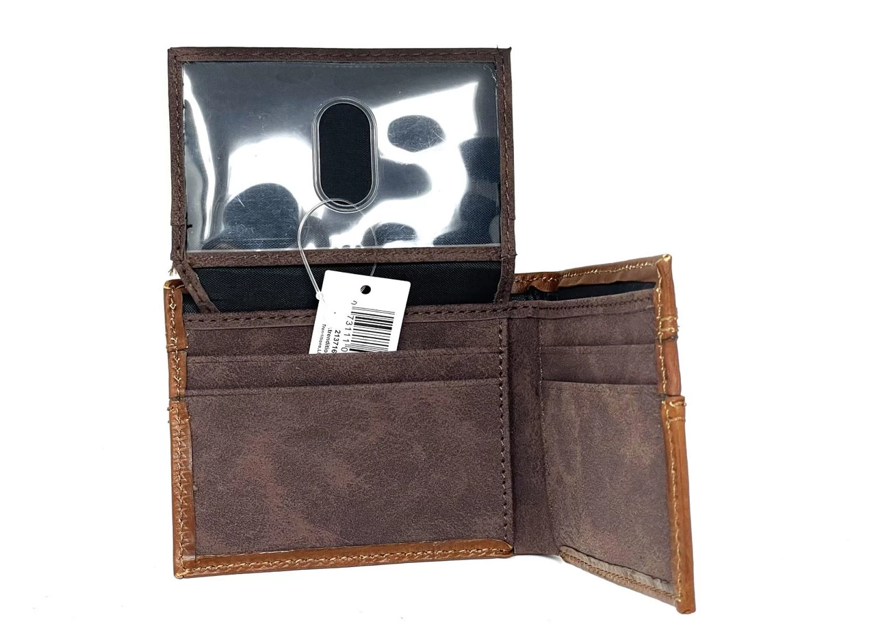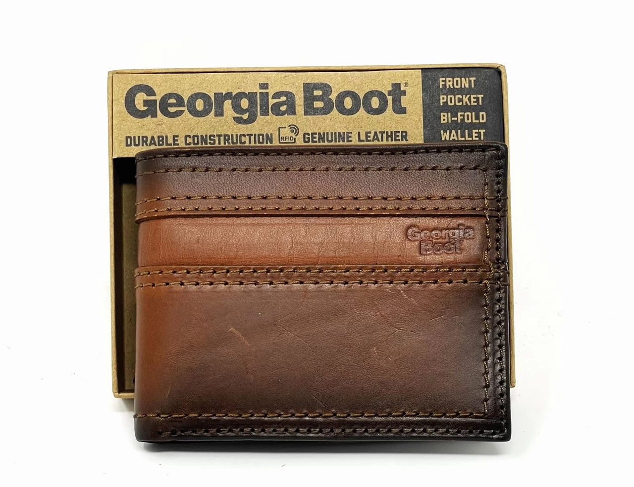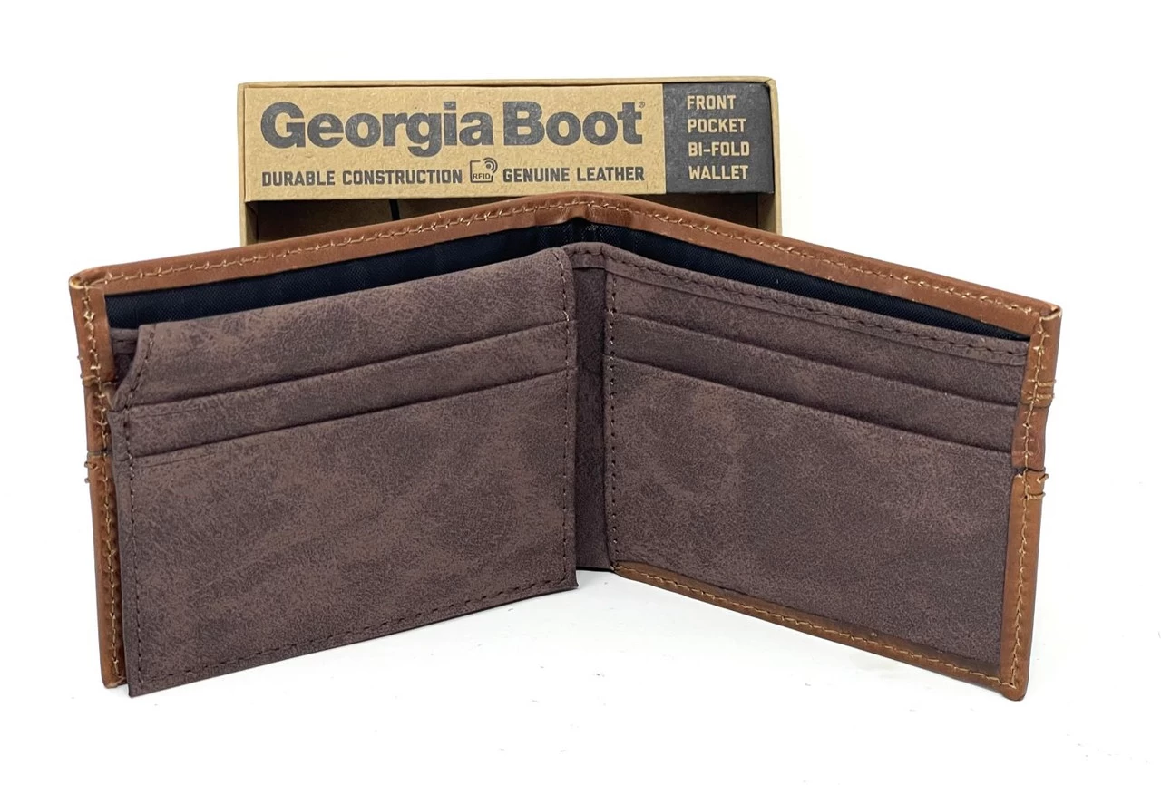 GEORGIA BOOT GENUINE LEATHER BIFOLD WALLET, BURNISHED BROWN W/TEXTURED INLAY, DOUBLE STITCH, 3 OPEN SLOT POCKETS, 6 CREDIT CARD SLOTS, LICENSE HOLDER, RFID LINING.