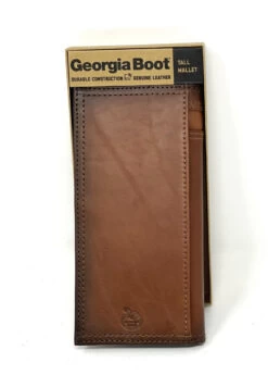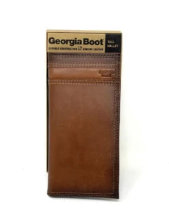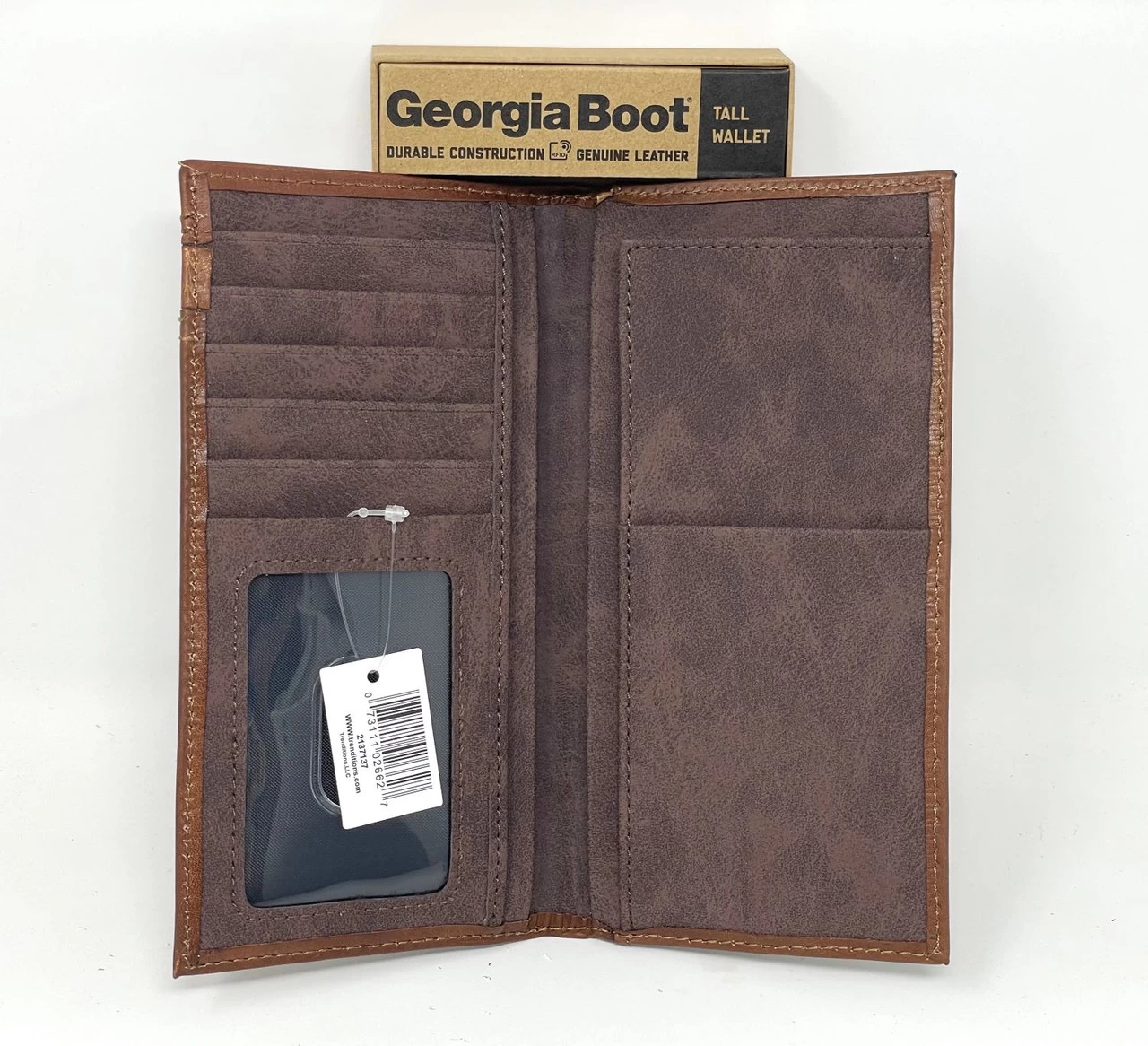 GEORGIA BOOT GENUINE LEATHER TALL WALLET, BURNISHED BROWN W/TEXTURED INLAY, DOUBLE STITCH, 5 OPEN SLOT POCKETS, 5 CREDIT CARD SLOTS, ID WINDOW, CHECKBOOK HOLDER, RFID LINING.