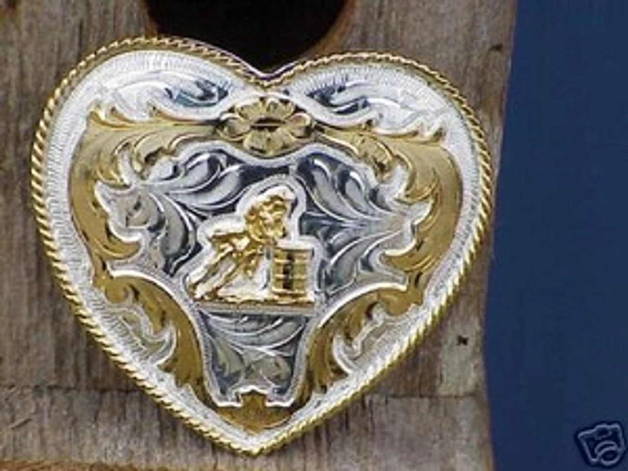 This beautiful buckle is a silver tone heart with gold tone border and barrel racer. It measures 3-1/4″ by 3″ and will fit a belt up to 1-3/4″ wide. This will add some real flare to any ladies belt.