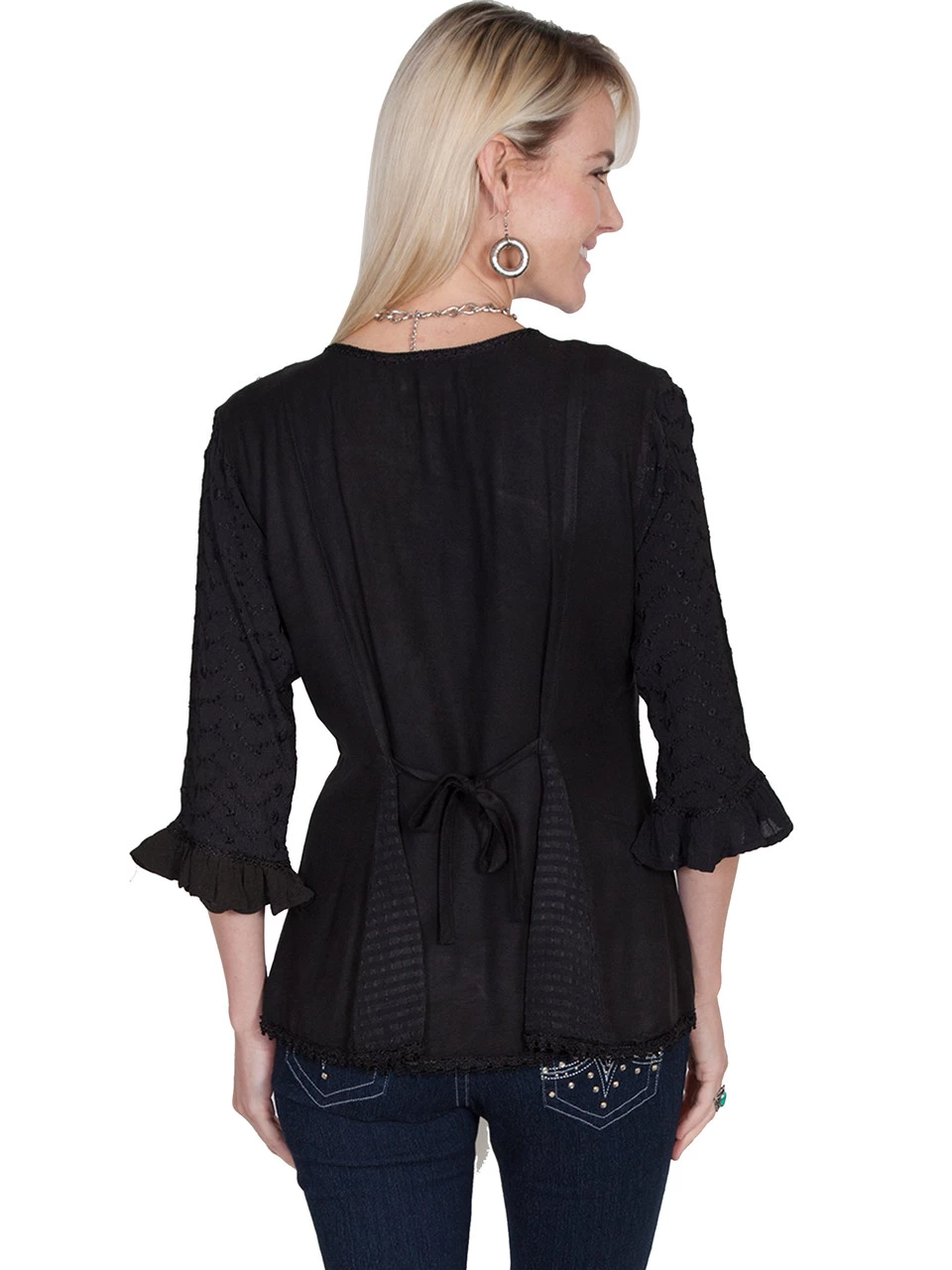 This beautiful 3/4 sleeve blouse from Scully’s Honey Creek collection is 100% rayon and available in three colors. It features a tonal embroidered front and tie back.