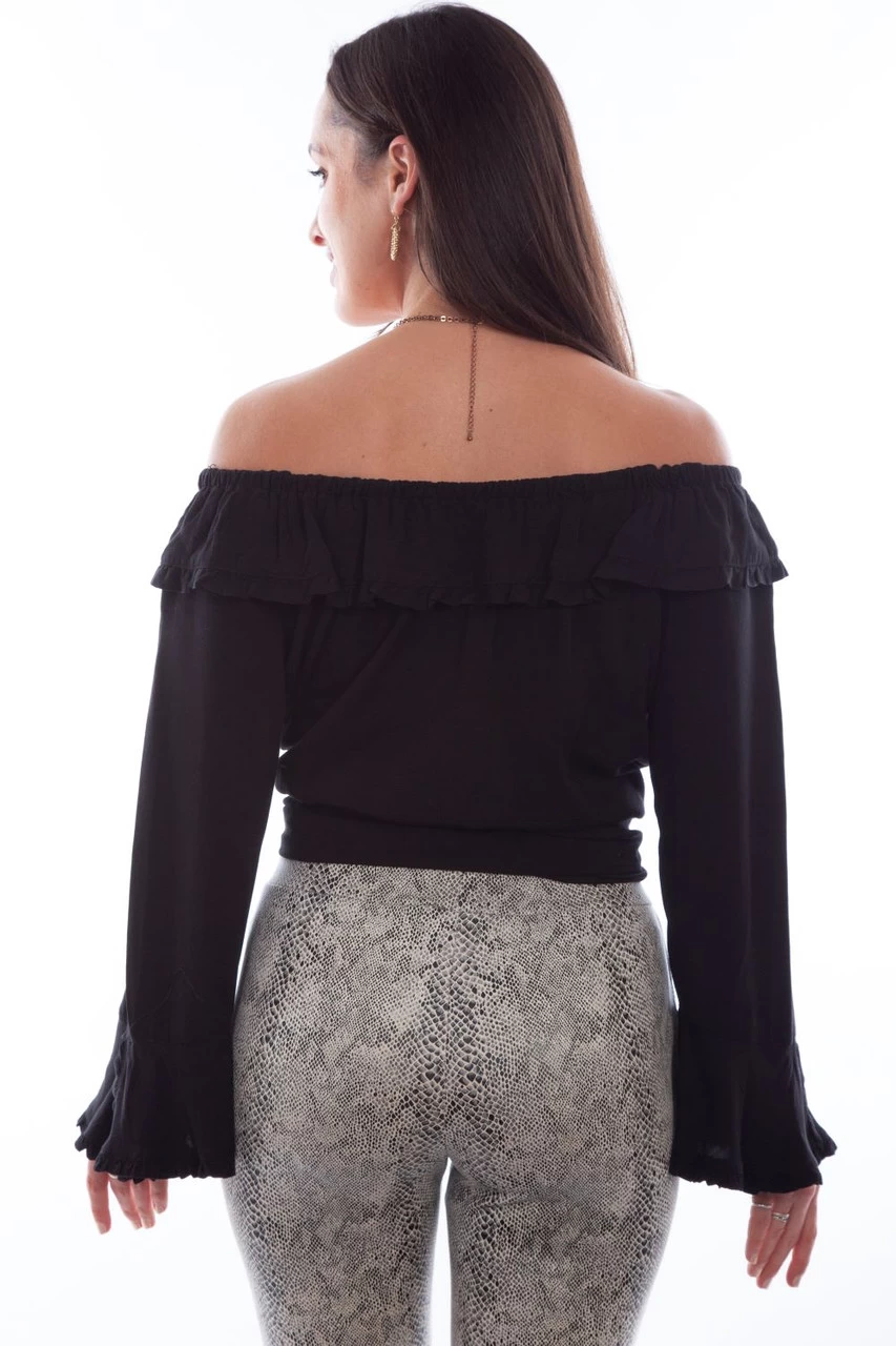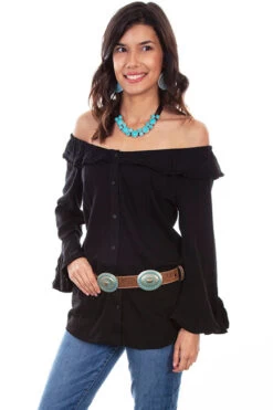 Available in a number of colors this on or off the shoulder top is from Scully’s Honey Creek Collection. Generously cut with a loose drapey silhouette it is made of100% rayon and features a ruffled collar and long sleeve ruffled cuffs.