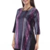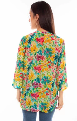 This fun top from Scully’s Honey Creek collection features a full button front, 3/4 sleeves, a band collar and a fun color print fabric. Cupro/viscose blend fabric is light and airy.