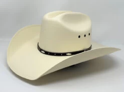 Justin’s Black Hills is a lightweight, handwoven, 10X Toyo straw hat. It has a 4″ brim and a 4 5/8″ cattleman crown (measurements are approximate). Features include a decorative faux leather band with studs and diamond shaped conchos, eyelets and a leatherette sweatband.