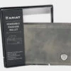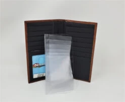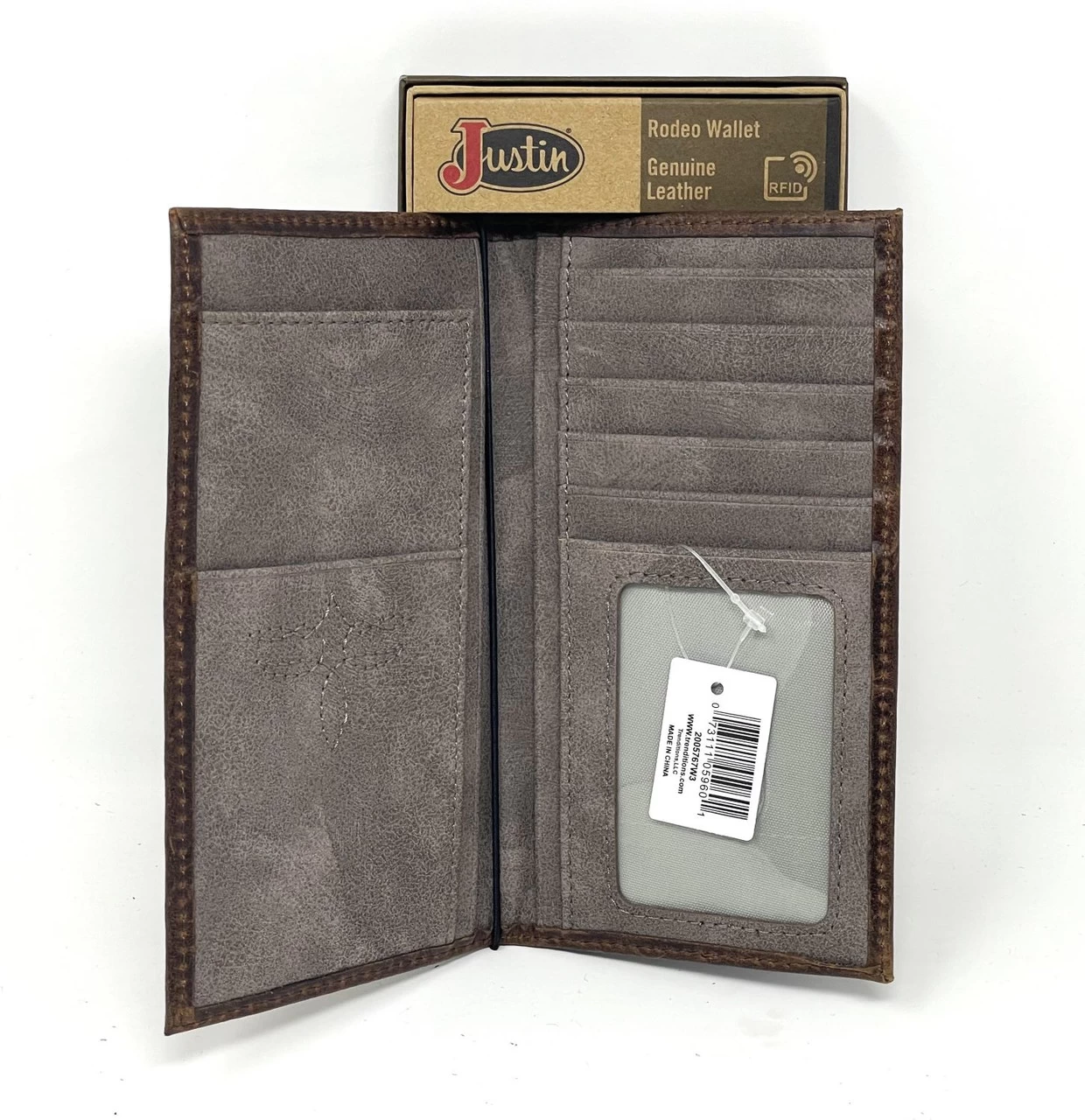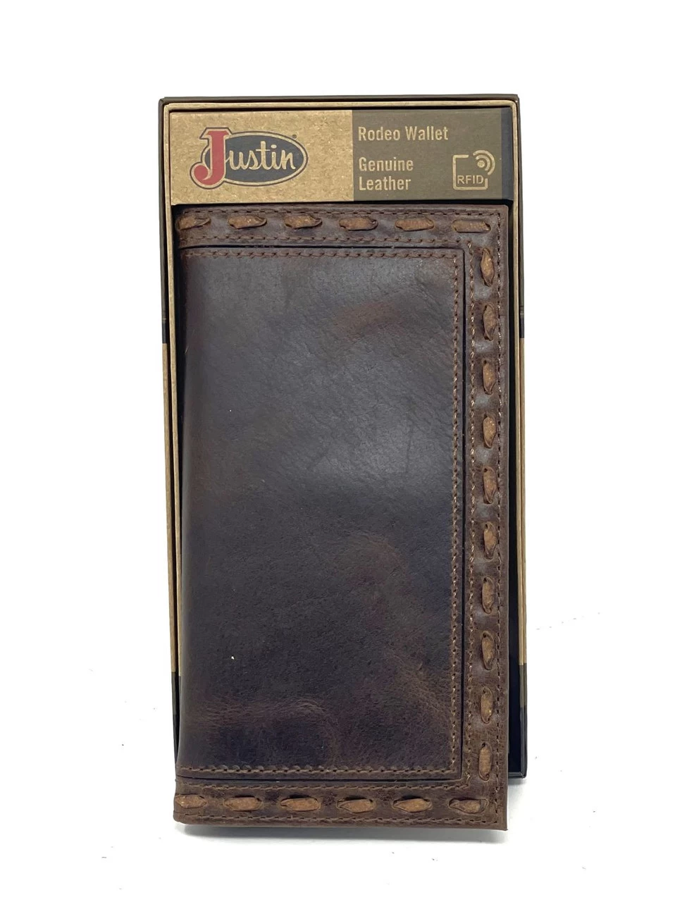 JUSTIN MEN’S GENUINE LEATHER RODEO WALLET, STAGE COACH DARK BROWN WITH NATURAL BONE RAWHIDE WHIP STITCH, 5 OPEN SLOT POCKETS, 5 CC SLOTS, 1 LICENSE HOLDER.