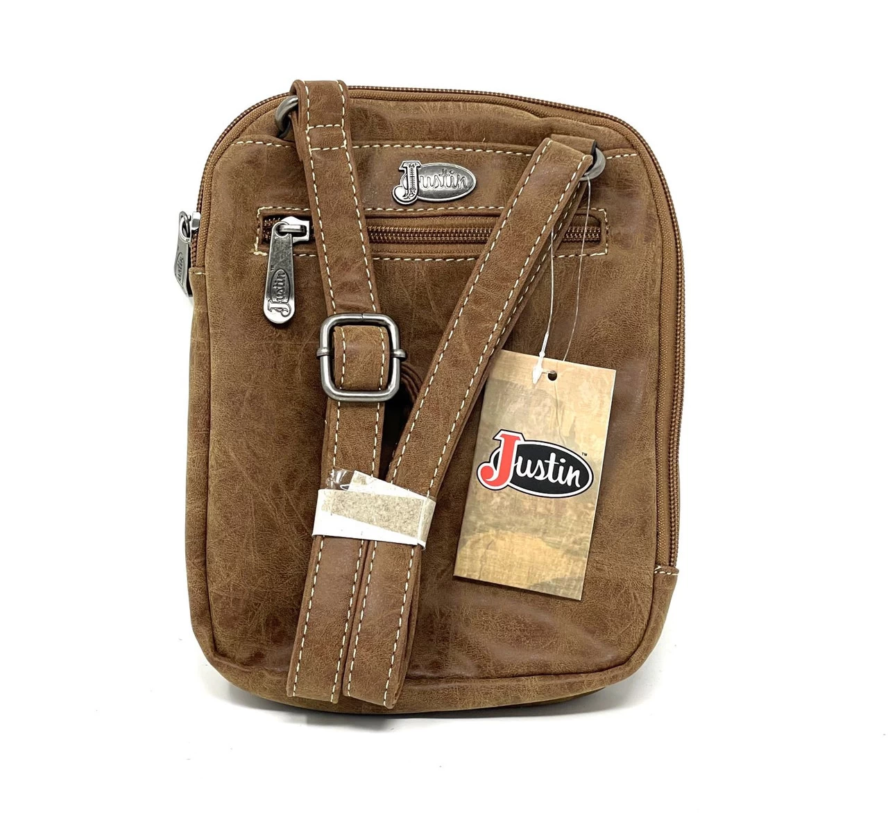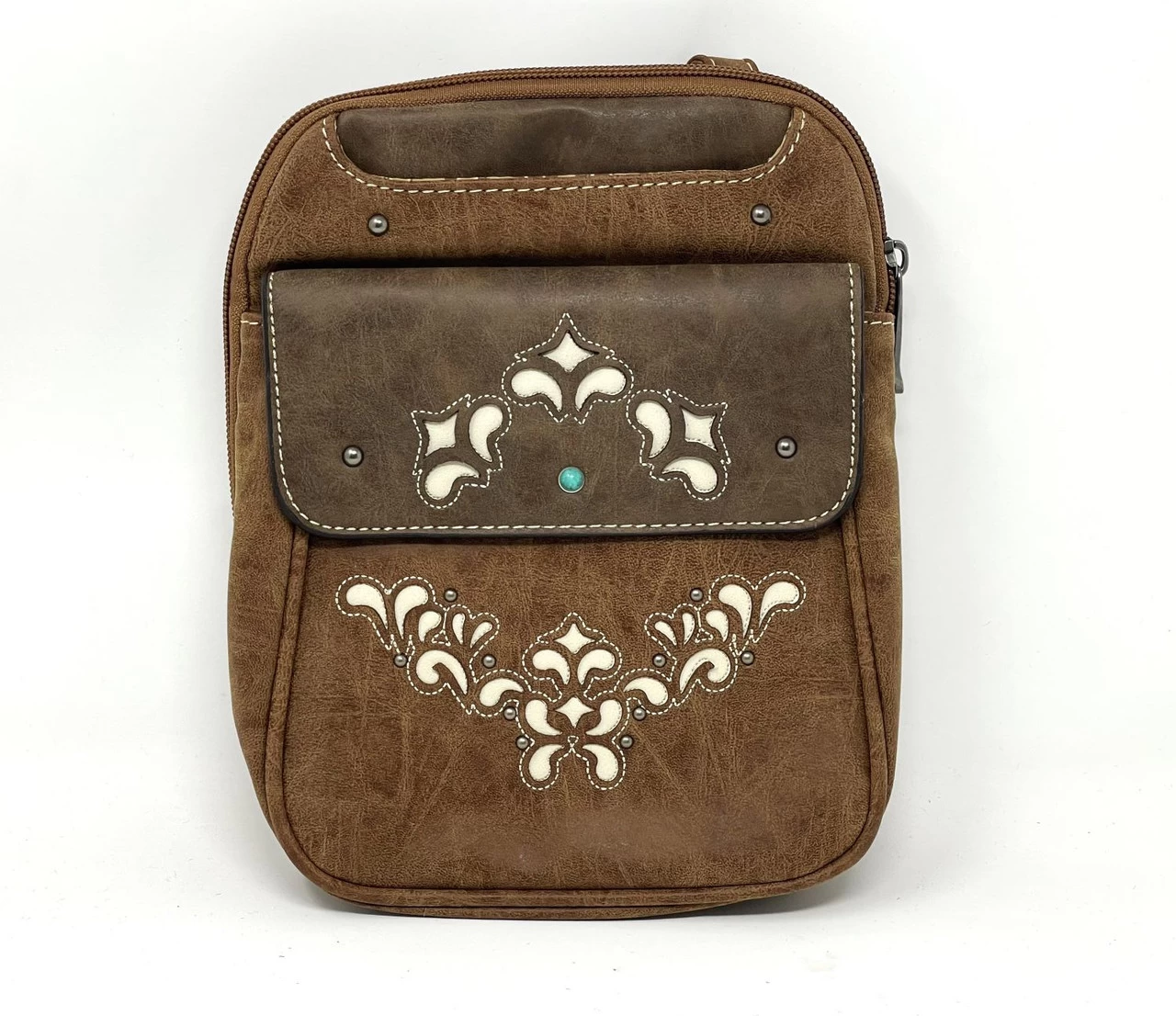 JUSTIN SMALL CROSSBODY, TONAL BROWN W/LASER CUT DETAILS W/IVORY INLAY, TURQUOISE & METAL STUDS, 1 INTERIOR COMPARTMENT, 1 ORGANIZATIONAL POCKET, 3 CREDIT CARD SLOTS, 1 ZIP POCKET, 1 OPEN SLOT EXTERIOR POCKET, 1 EXTERIOR FLAP POCKET W/MAG SNAP CLOSURE, 1 BACK EXTERIOR ZIP POCKET, ADJUSTABLE SHOULDER STRAP, ZIP TOP CLOSURE.