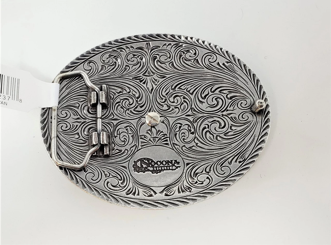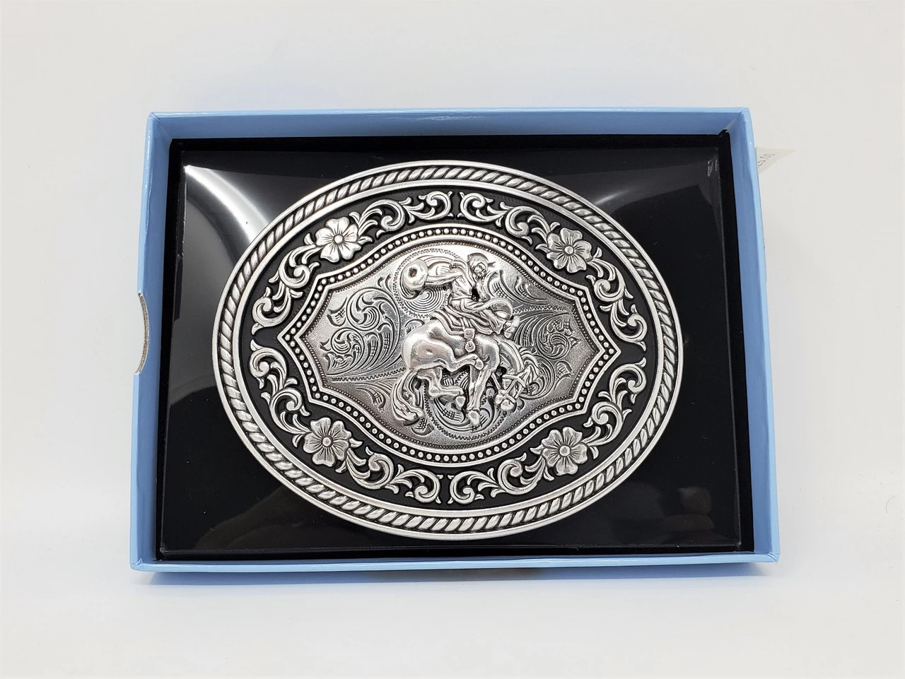 Bronc Buster buckle by Nocona measures 3 3/4″ x 4 1/8″ and will fit belts up to 1 1/2″ wide. It features a rope edge and scrolling on a black matte background.