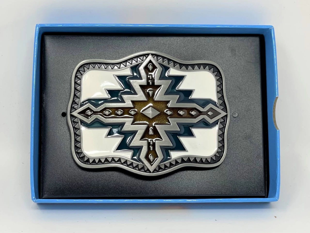 A nice-looking decorative buckle by Nocona featuring a colorful enamel Southwestern design. It measures 2 7/8″ x 3″ and will fit belts up to 1 1/2″ wide.