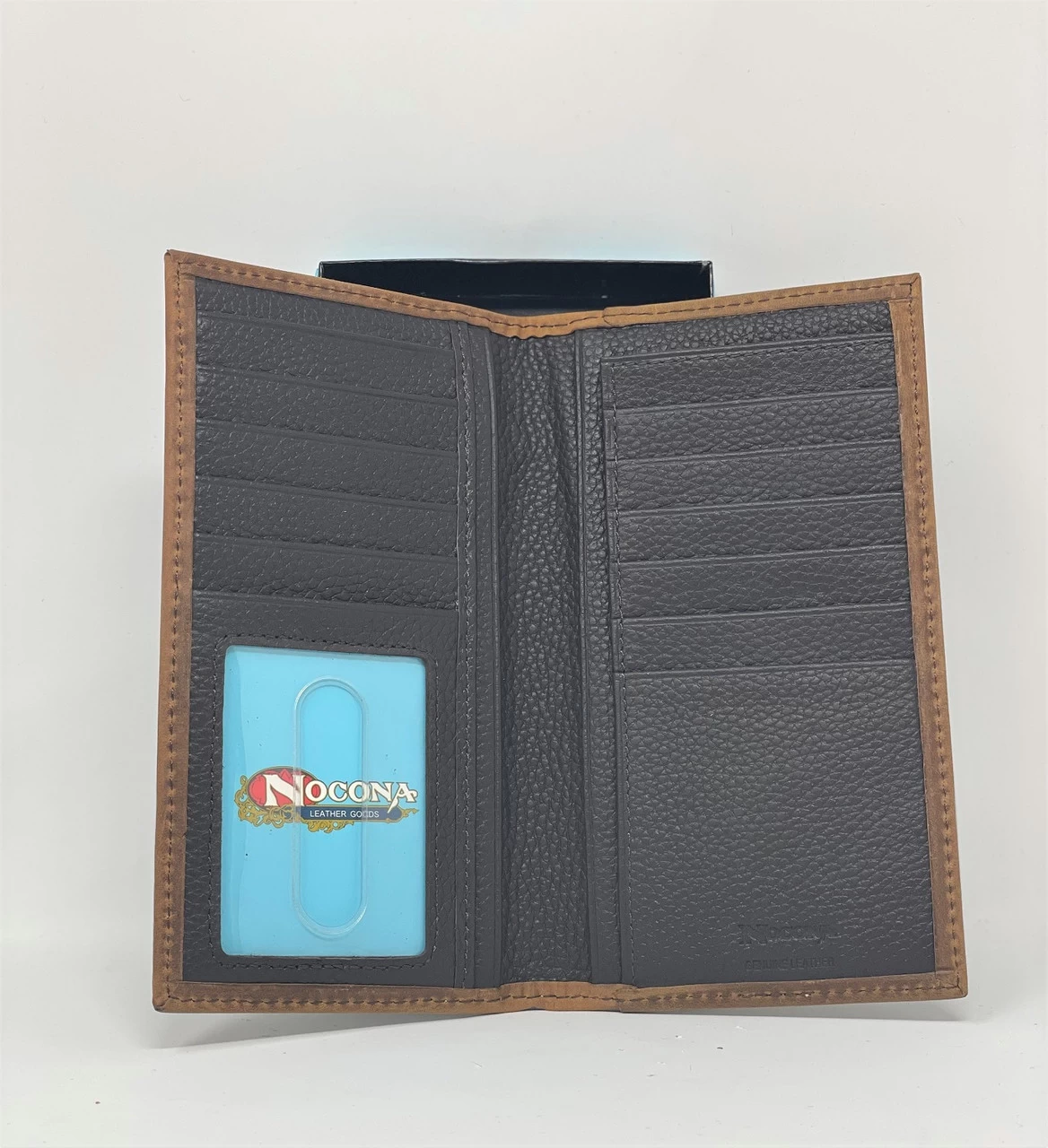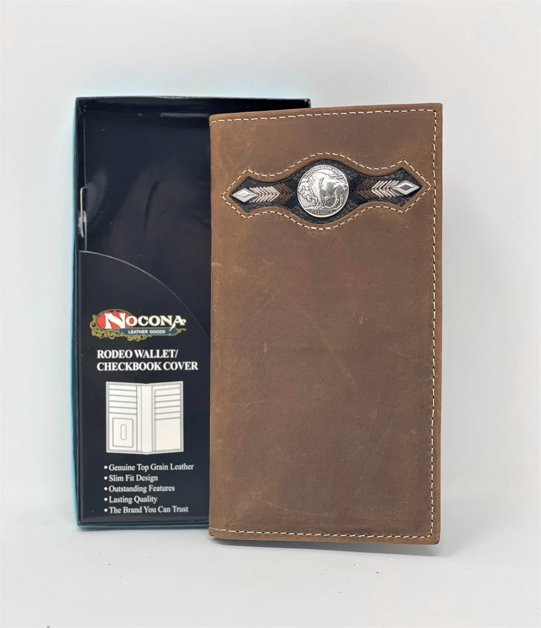 This great looking Rodeo wallet from Nocona is constructed of top grain distressed leather. Accented with a buffalo nickel it has plenty of slots for your credit cards.