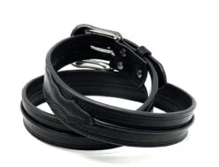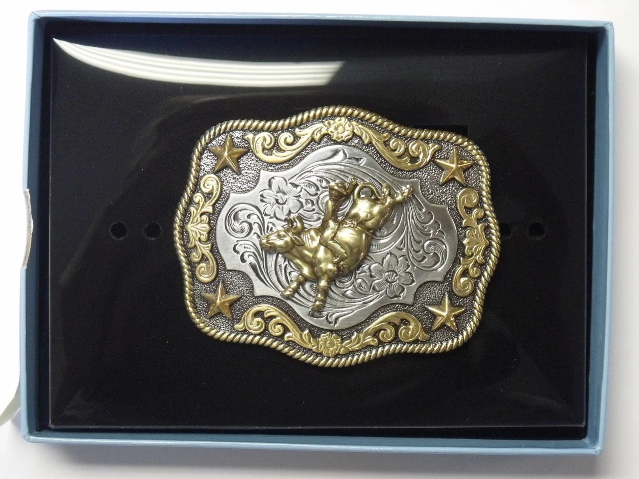 Fancy youth size buckle by Nocona in gold and silver tones featuring a bull rider and floral design. It comes boxed, measures 2″ X 2 3/4″ and will fit belts up to1 1/4″ wide.