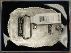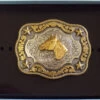 Youth size buckle by Nocona in gold and silver tones featuring a bull rider. It comes boxed, measures 2″ X 3″ and will fit belts up to1 1/2″ wide.