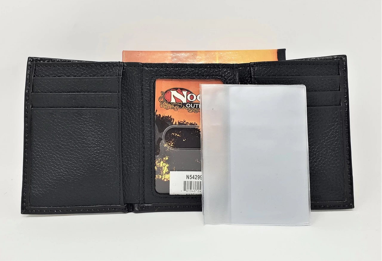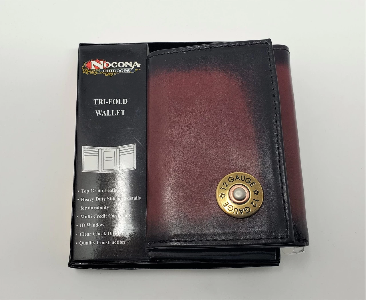 This tri-fold wallet by Nocona is made of top grain dark brown leather and features a 12 guage shotgun shell.