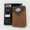 This Chocolate brown Rodeo wallet from Nocona is made to last. Constructed of top grain leather it features tooling and a metal Lone Star concho.