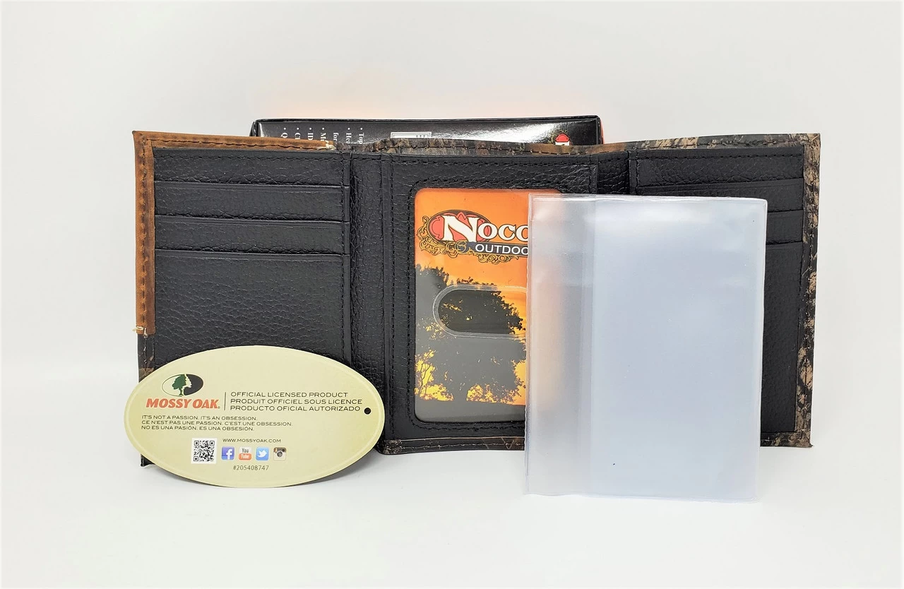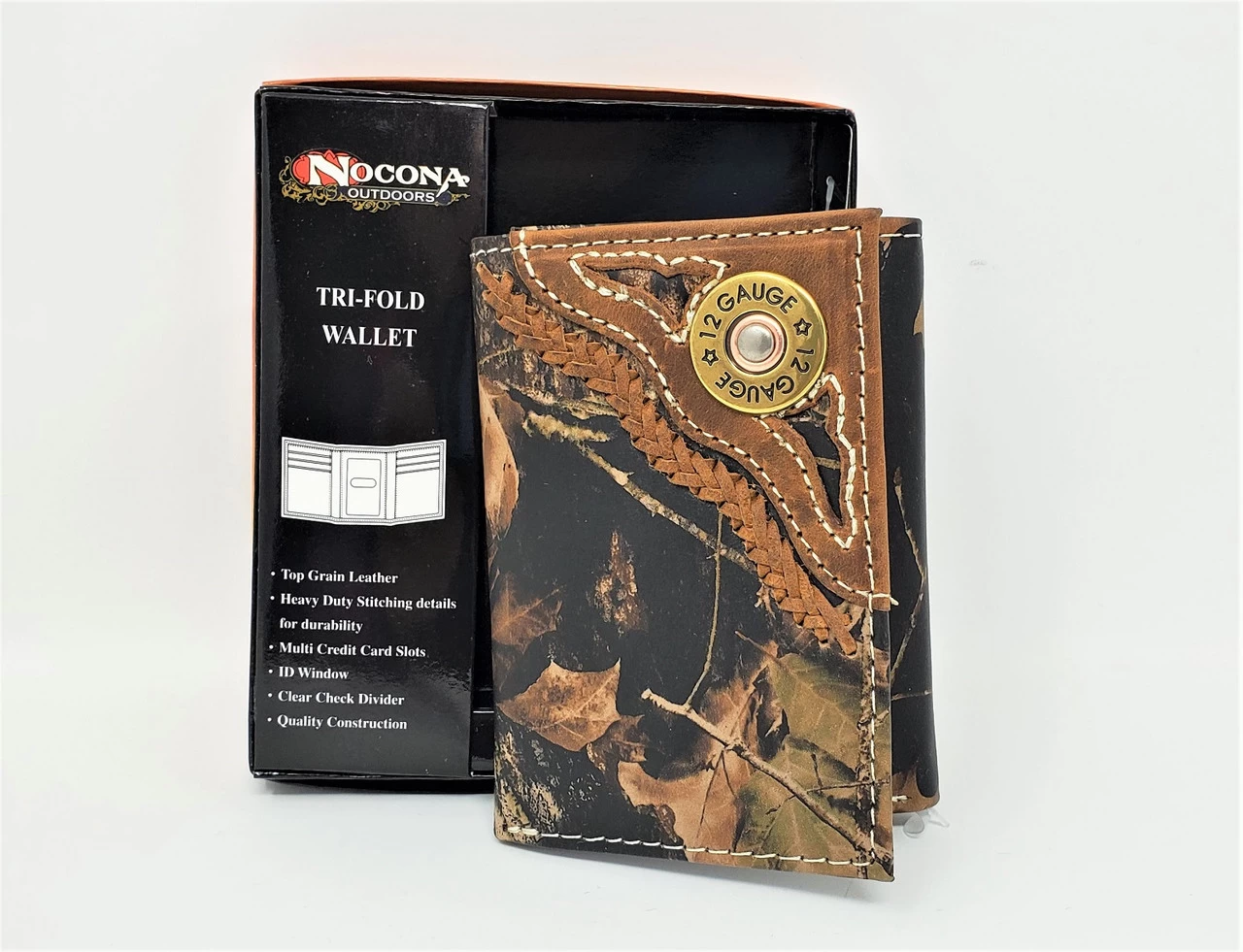 Made of genuine top grain leather this tri-fold wallet by Nocona is in the Mossy Oak camouflage design. It features a 12 gauge bullet on a brown leather overlay with leather lacing border.