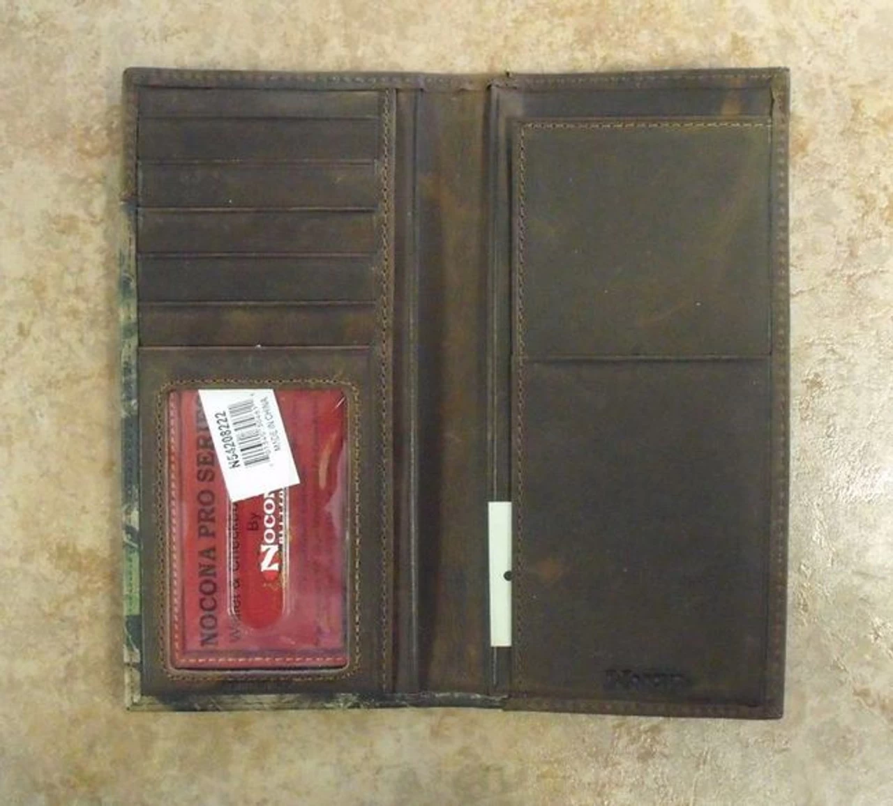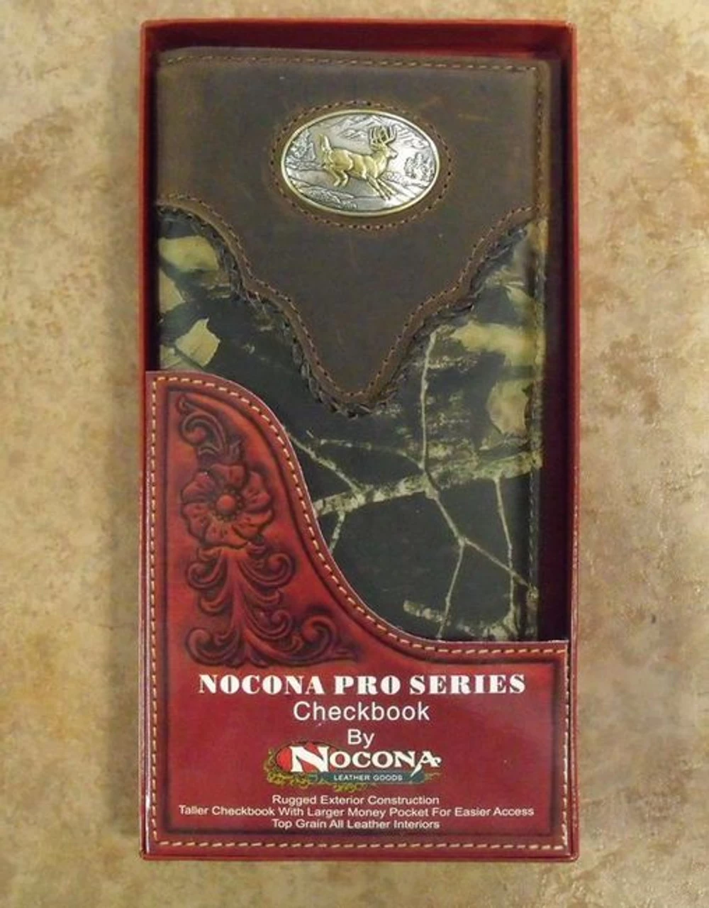 This rodeo wallet/checkbook cover from Nocona’s Pro Series has a taller checkbook and larger money pocket for easier access. It features a rugged Mossy Oak fabric exterior with a leather overlay and buck concho and top grain leather interior.