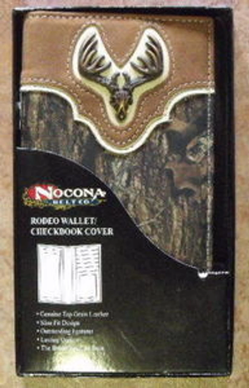 Made of genuine top grain leather this rodeo wallet/checkbook cover by Nocona is in the Mossy Oak camouflage design. It features a deerskull on a brown leather overlay.